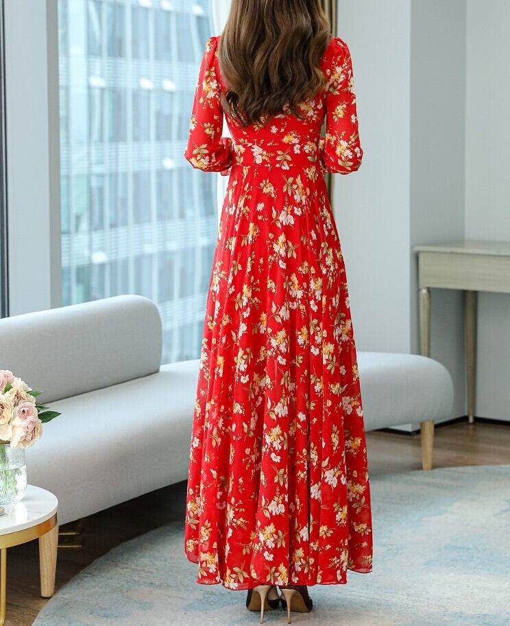 4色 レトロ風 春服 ワンピース 長袖 秋 春夏 きれいめ ロング シャツワンピース ワンピドレス ロング丈 マキシ丈 9分丈 アンクル丈 キャンディスリーブ ボウタイ フレア セミフレア Aライン プリーツ フリル ウエストマーク 白 ホワイト 赤 レッド 黄色 イエロー 春カラー 秋カラー アプリコット S M L XL 2XL 3XL 4XL 小さいサイズ 大きいサイズ 大人可愛い 大人 おしゃれ ナチュラル レトロ 花柄 小花柄 ガーリー エレガント 10代 20代 30代 40代