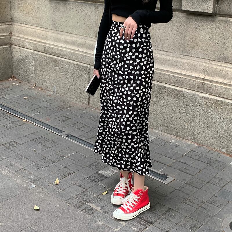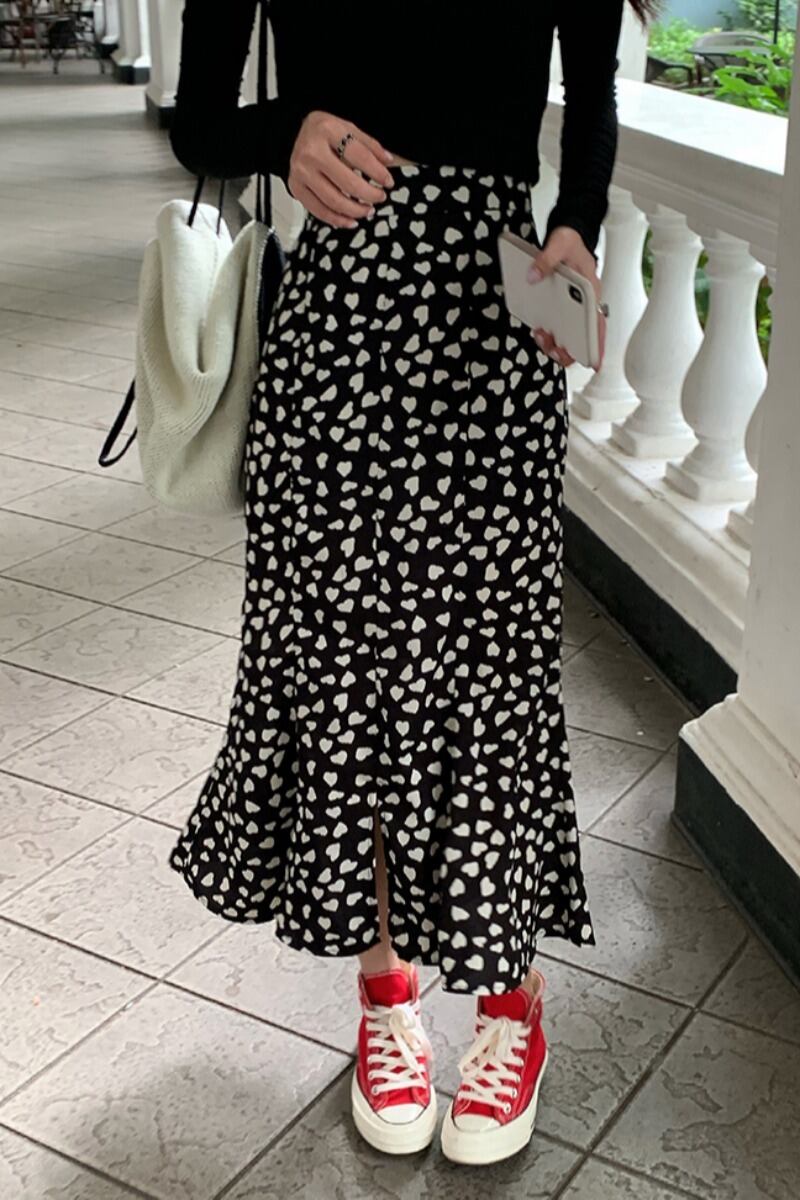 2色 スカート 秋 春夏 かわいい マーメイドスカート シフォンスカート ロング丈 ハート柄 シフォン ハイウエスト Aライン ふんわり フレア 裾フレア 白 ホワイト 黒 ブラック モノトーン 大人可愛い シンプル カジュアル 大人 おしゃれ お洒落 S M L ジャスト こなれ感 ラフ ラブリー キュート ガーリー 主役級 とろみ感 10代 20代 スリム ストレート 着回し 普段使い 韓国 韓国系 オルチャン モテ 美脚 脚長 通学 デート お出かけ 女子会 イベント 旅行 ショッピング