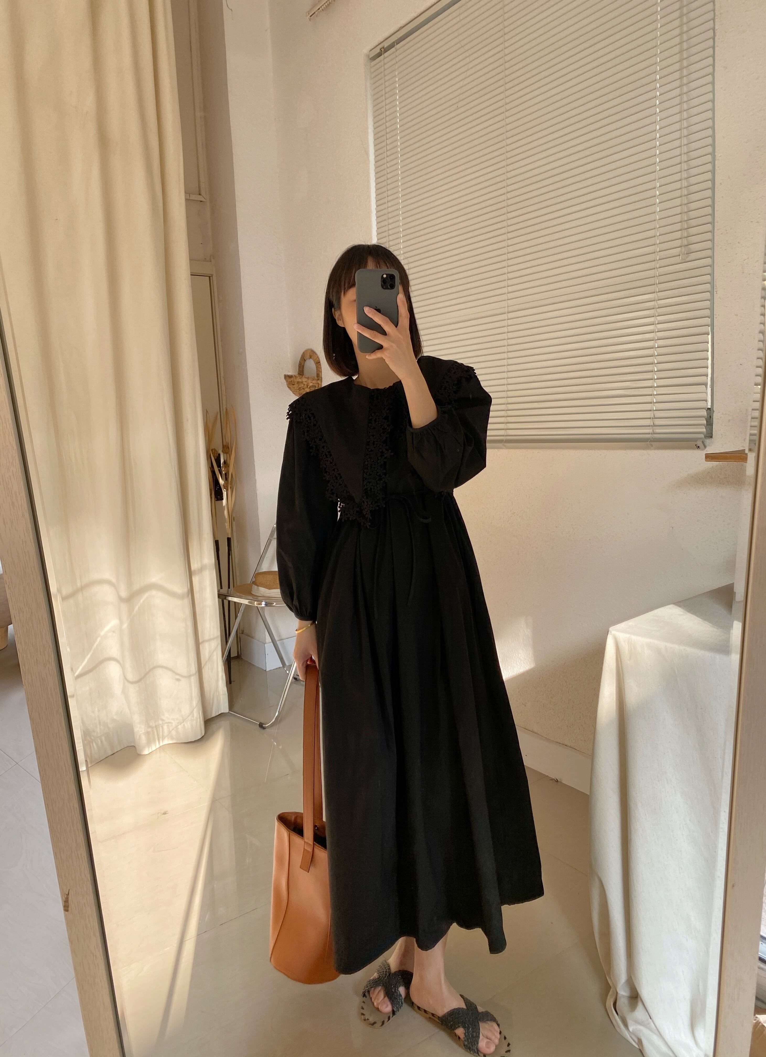 2色 ワンピース 長袖 春 秋 きれいめ ロング aライン Aライン ワンピドレス ロング丈 マキシ丈 パフスリーブ Uネック ラウンドネック レース襟 フラワー 襟付き 大きな襟 でか襟 ビッグカラー セミフレア レース ウエストリボン 白 ホワイト 黒 ブラック ワンサイズ フリーサイズ 大きめ ゆったり ゆる 大人可愛い きれいめ シンプル カジュアル 大人 おしゃれ ナチュラル フェミニン 無地 韓国 韓国系 体型カバー こなれ感 ガーリー 主役級 存在感 フォーマル 休日 イベント