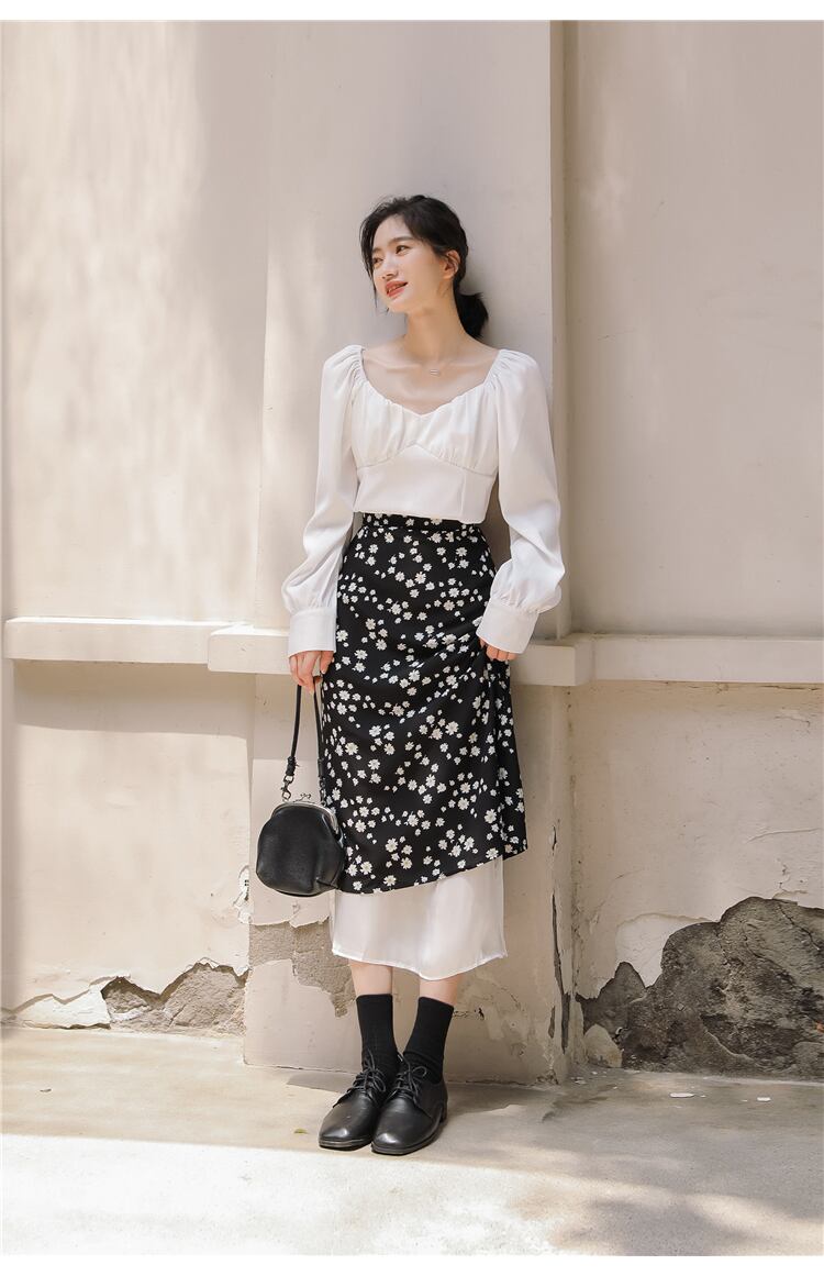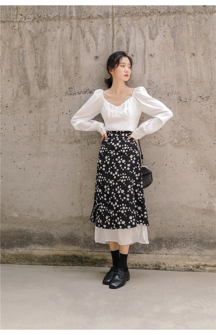 スカート 春 秋 かわいい シフォンスカート ミモレ丈 ロング丈 花柄 小花柄 フラワー シフォン ハイウエスト Aライン フェイクツーピース 白 ホワイト 黒 ブラック 大人可愛い きれいめ シンプル 大人 上品 おしゃれ お洒落 レトロ クラシカル S M L ジャスト こなれ感 キュート ガーリー 主役級 存在感 とろみ感 フェミニン スリム ストレート 普段使い 韓国 韓国系 オルチャン 楽ちん モテ 美脚 脚長 オフィス 通勤 通学 デート お出かけ 公園デビュー 女子会 イベント
