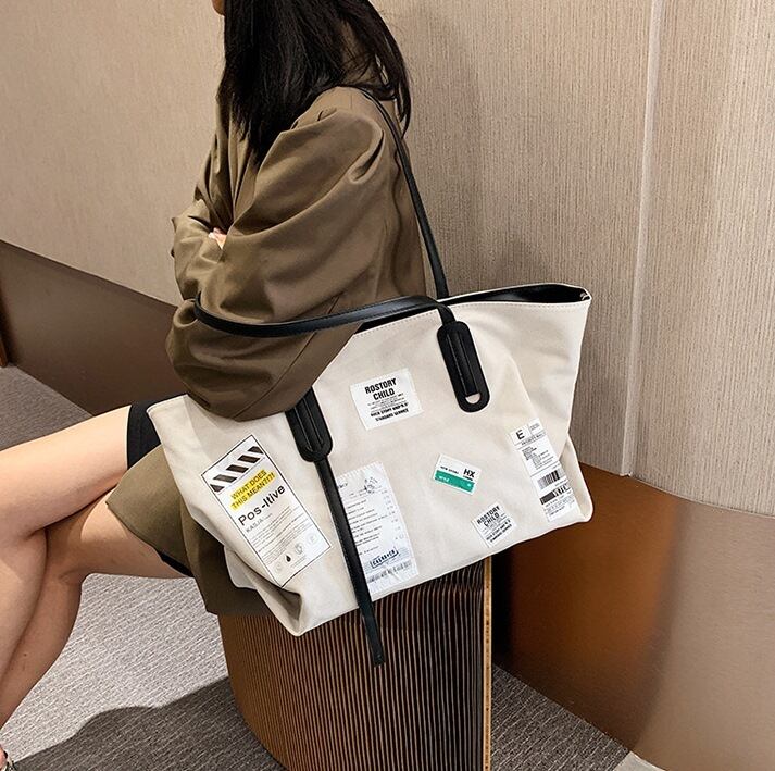 トートバッグ レディース ショルダーバッグ ハンドバッグ 手提げカバン 肩掛けカバン トラベルバッグ デザインバッグ トラベル お出かけ 旅行 大容量 出張 大きめ 肩掛け ビジネス 軽い トラベル デザイン 柄 普段使い ベージュ 生成り色 ブラック 黒 グレー 灰色 タグ風 アクセント 10代 20代 30代 他と被らない 3色展開 便利