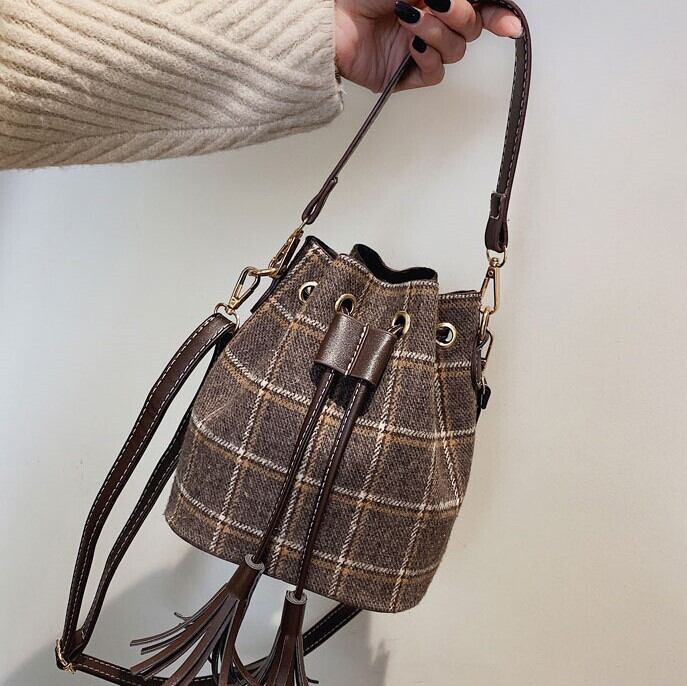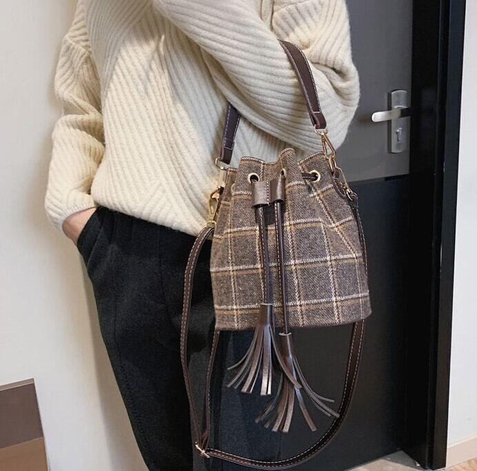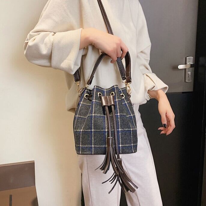 ショルダーバッグ レディース バルーンバッグ バケットバッグ ワンショルダー ハンドバッグ 肩掛けカバン 手持ちカバン マニッシュ キュート ガーリー エレガント 大人可愛い チェック柄タッセル 秋 冬 トレンド こなれ感 デート お出かけ 女子会 ブルー ブルーチェック