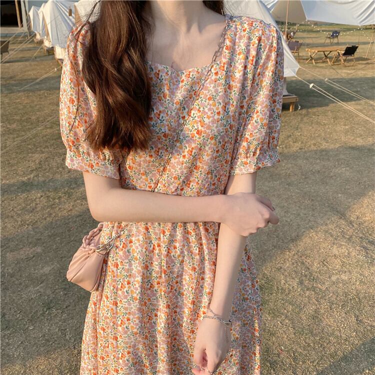 2色 ワンピース 半袖 春夏 かわいい ロング シャツワンピース ひざ丈 五分袖 パフスリーブ スクエアネック 襟なし フレア 細身 Aライン ウエストマーク ハイウエスト 色展開 ブルー オレンジ ワンサイズ ゆったり かわいい 大人可愛い シンプル カジュアル 大人 おしゃれ リラックス 小花柄 コーデ スタイル 楽ちん モテ 体型カバー 脚長 普段使い トレンド こなれ感 ラフ ラブリー キュート ガーリー エレガント 主役級 存在感 OL 学生 デート お出かけ 女子会 イベント リゾート 旅行