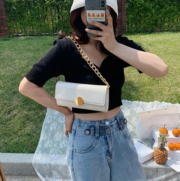 ゴールドチェーンが煌めく、エレガントなショルダーバッグ。