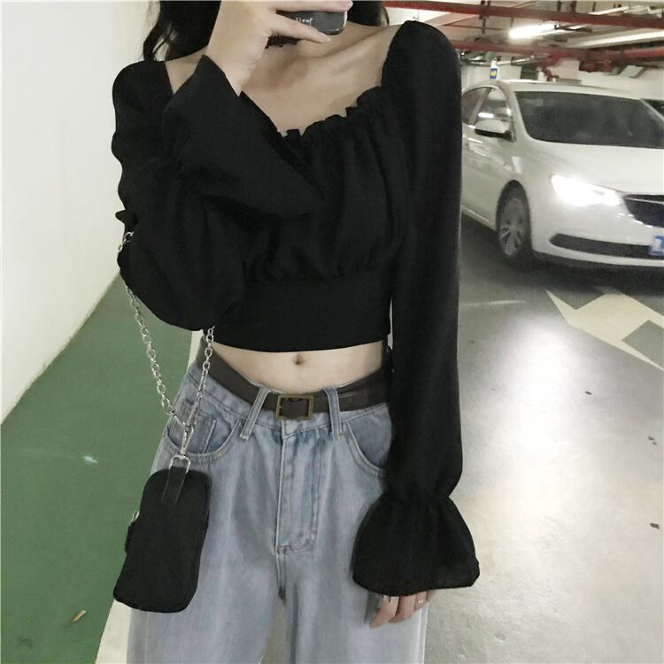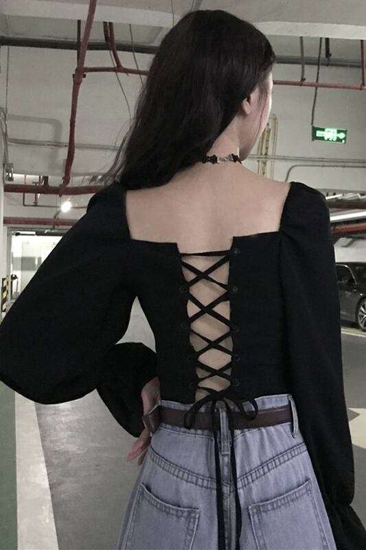 長袖シャツ レディース 長袖 普段着 着やせ シャツ 背中開き へそ出し トップス 大人可愛い セクシー 女子会 お出かけ ショッピング 買い物 可愛い シャツ デイリー スクエアネック パーティー スリム 春 秋 甘辛 ヘッジ シンプルシャツ シンプル 大人女子 大人カジュアル カジュアル ショートスタイル 個性 10代 20代 無地 プレーン 編み上げ リボン ブラック 黒 モノトーン