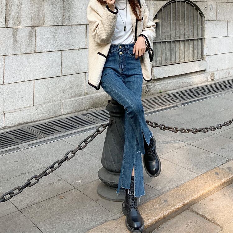 2色 ボトムス 春 カジュアル レディース デニムパンツ ロング丈 無地 スリット ファスナー ポケット フロントスリット ブラック ブルー かわいい 大人可愛い きれいめ シンプル カジュアル 大人 おしゃれ かっこいい サイズ S M L こなれ感 メンズライク マニッシュ ボーイッシュ ガーリー クール モダン 主役級 抜け感 女性用 高校生 中学生 OL 学生 10代 20代 30代 オールシーズン 着回し 普段使い ファッション コーデ スタイル 美脚 脚長 通勤 通学 デート お出かけ