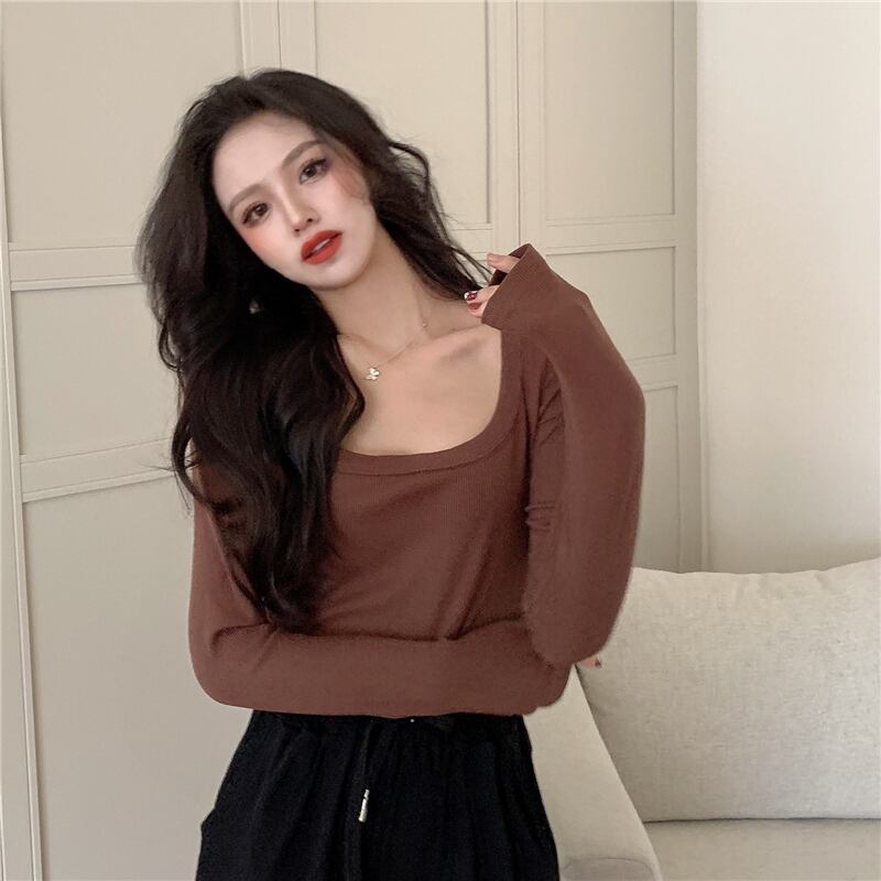 4色 コンパクト トップス Tシャツ ブラウス カットソー チュニック 秋冬 夏 かわいい カジュアル ショート ショート丈 長袖 萌袖 スクエアネック スリム タイト 細身 ストレート スマート 裾イン シンプル 白 ホワイト 黒 ブラック 茶色 ブラウン 灰色 グレー S M L かわいい 大人可愛い きれいめ シンプル カジュアル 大人 上品 おしゃれ ナチュラル かっこいい レトロ 無地 韓国 韓国系 オルチャン 韓国ファッション 体型カバー 定番 普段使い インスタ映え こなれ感 ラフ