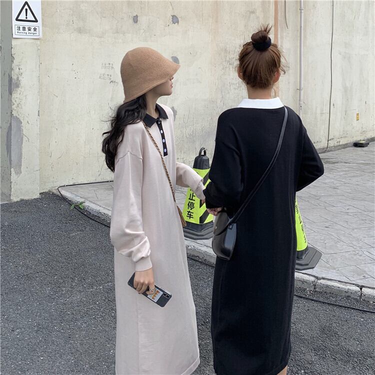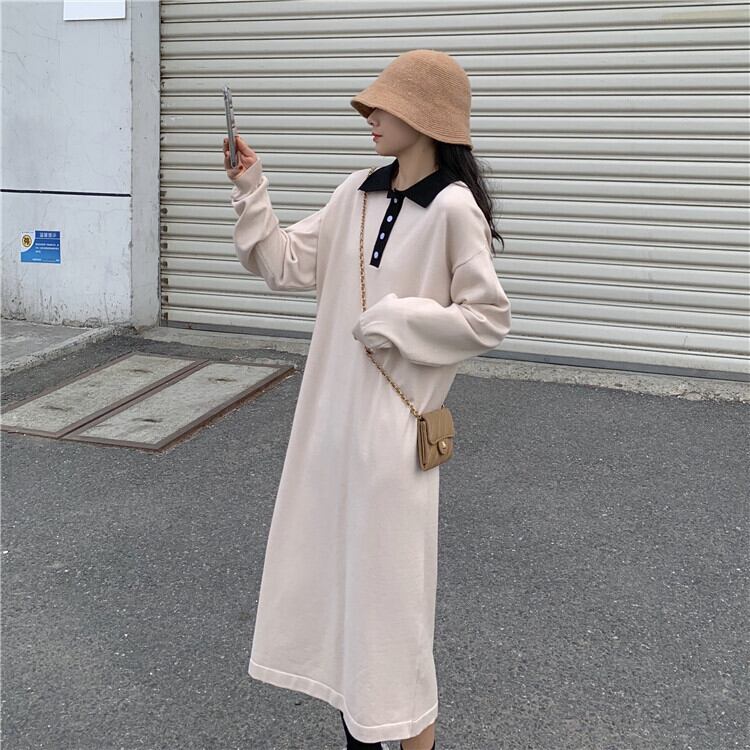 2色 レトロ風 ワンピース 長袖 春 秋 冬 きれいめ カジュアル かわいい フォーマル シャツワンピース ワンピドレス 膝丈 ひざ丈 膝下 ミディアム丈 ミドル丈 萌袖 襟付き POLO襟 スリム タイト 細身 ストレート Iライン ボタン 黒 ブラック アプリコット S M L XL かわいい 大人可愛い きれいめ シンプル カジュアル 大人 上品 おしゃれ ナチュラル かっこいい レトロ 無地 韓国 韓国系 オルチャン 韓国ファッション 体型カバー 美脚 脚長 定番 普段使い インスタ映え