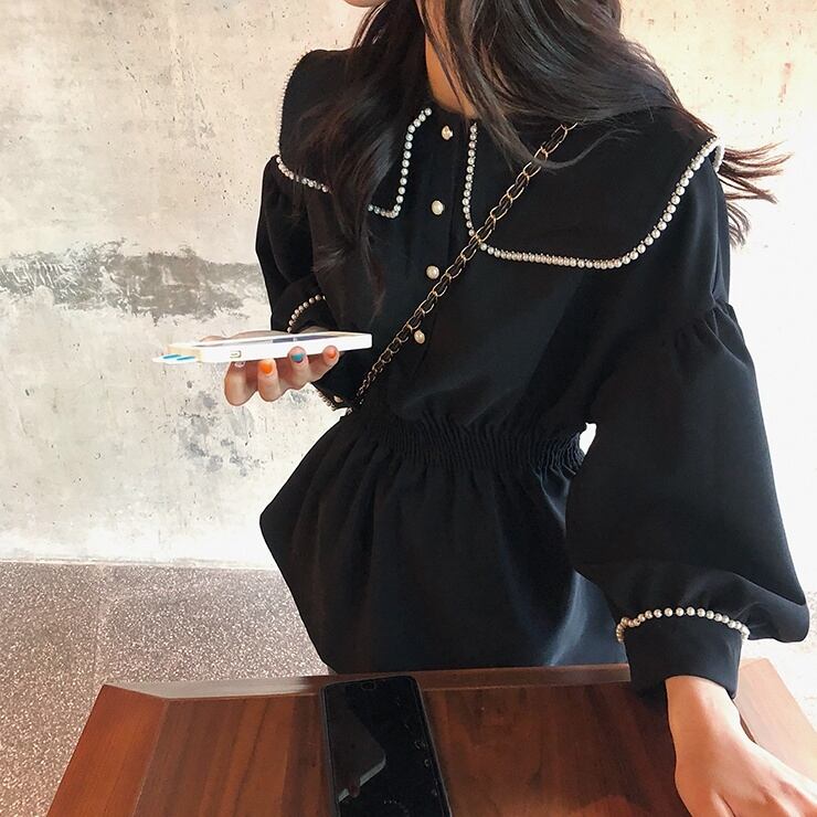 レトロ風 トップス シャツ ブラウス チュニック 夏 春 秋 かわいい きれいめ カジュアル ショート ショート丈 長袖 ボリューム袖 キャンディスリーブ ぽわん袖 ドールカラー ワイドカラー ビッグカラー フレア セミフレア ペプラム 裾ワイド シフォン シンプル パール 黒 ブラック ワンサイズ かわいい 大人可愛い きれいめ シンプル カジュアル 大人 上品 おしゃれ ナチュラル かっこいい レトロ 無地 韓国 韓国系 オルチャン 韓国ファッション 体型カバー 定番 普段使い インスタ映え