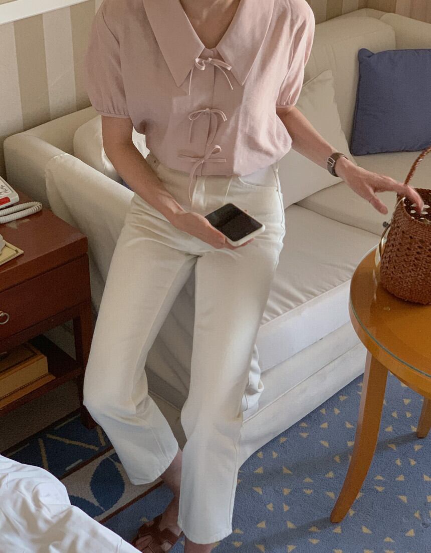 3段リボンとパフスリーブがレトロな半袖ブラウスです。