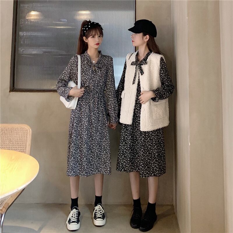 3色 レトロ風 ワンピース 長袖 春 秋 きれいめ カジュアル かわいい フォーマル aライン シャツワンピース Aライン フレア ワンピドレス ぽわん袖 ボリューム袖 ボリュームスリーブ キャンディスリーブ Vネック フレア セミフレア シフォン ウエストマーク 黒 ブラック 青 ブルー アプリコット ライトブルー ワンサイズ かわいい 大人可愛い きれいめ シンプル カジュアル 大人 上品 おしゃれ ナチュラル レトロ フェミニン 花柄 小花柄 フラワー 韓国 韓国系 オルチャン 韓国ファッション