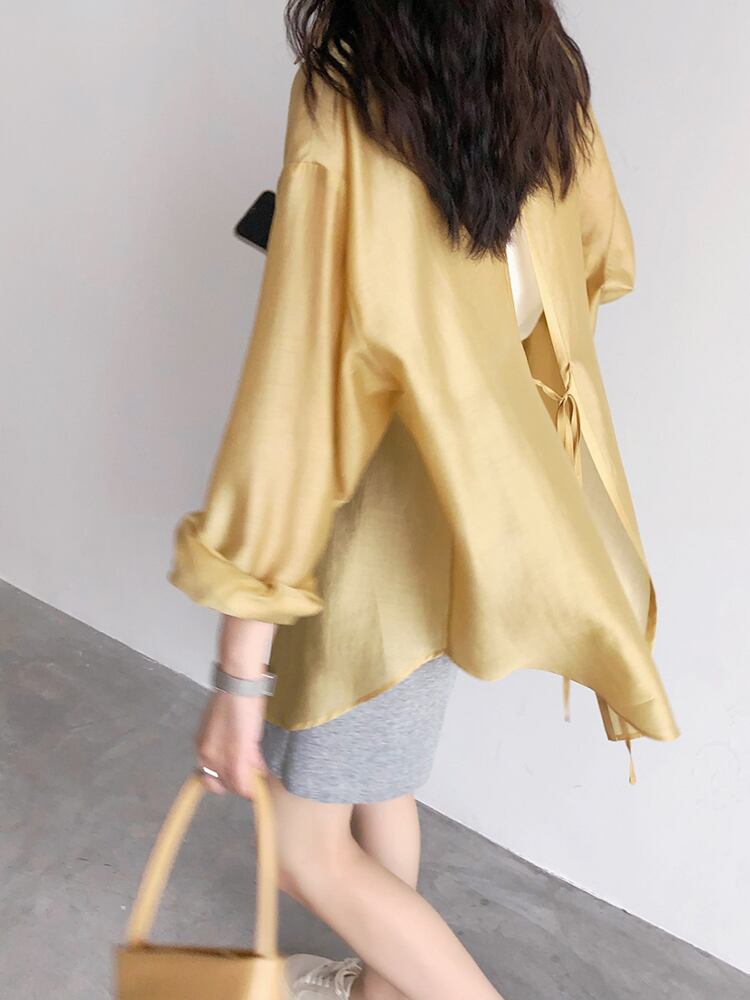 4色 トップス シャツ レディース 夏 きれいめ 長袖 ゆったり 長袖 ドロップショルダー 萌袖 襟付き BIGシルエット バックリボン バックスリット バックコンシャス 前開き 透け感 シースルー 色展開 ホワイト ブルー イエロー ピンク パステルカラー M L かわいい 大人可愛い きれいめ シンプル カジュアル 大人 おしゃれ ナチュラル リラックス 無地 コーデ スタイル 楽ちん 体型カバー 普段使い 重ね着 10代 20代 30代 40代 こなれ感 ラフ ガーリー ルーズ 抜け感 OL 通勤