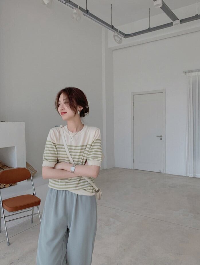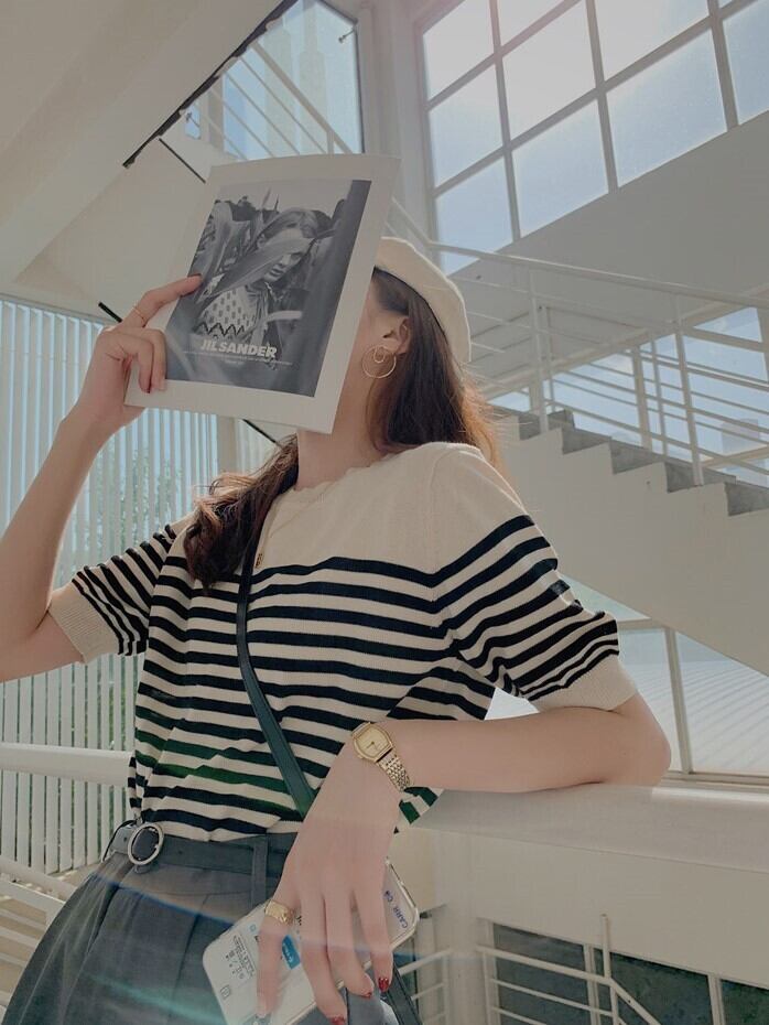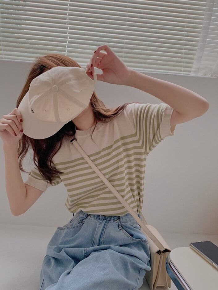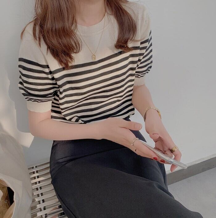 可愛いボーダーラインのサマーニット。