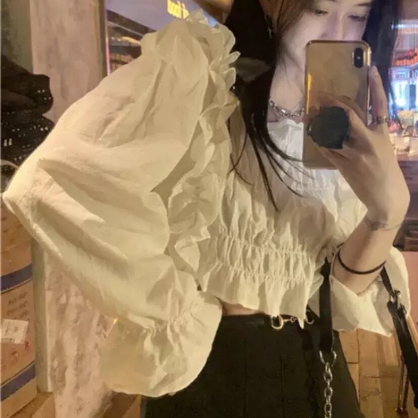 フロントシャーリングデザインがバストを綺麗に見せてくれます♪トレンドのパフスリーブが二の腕もカバーしてくれます!! また、短めの丈が、ハイウェストのボトムと合わせるだけで脚長効果抜群です!!