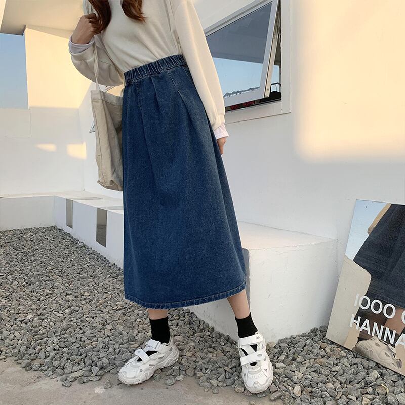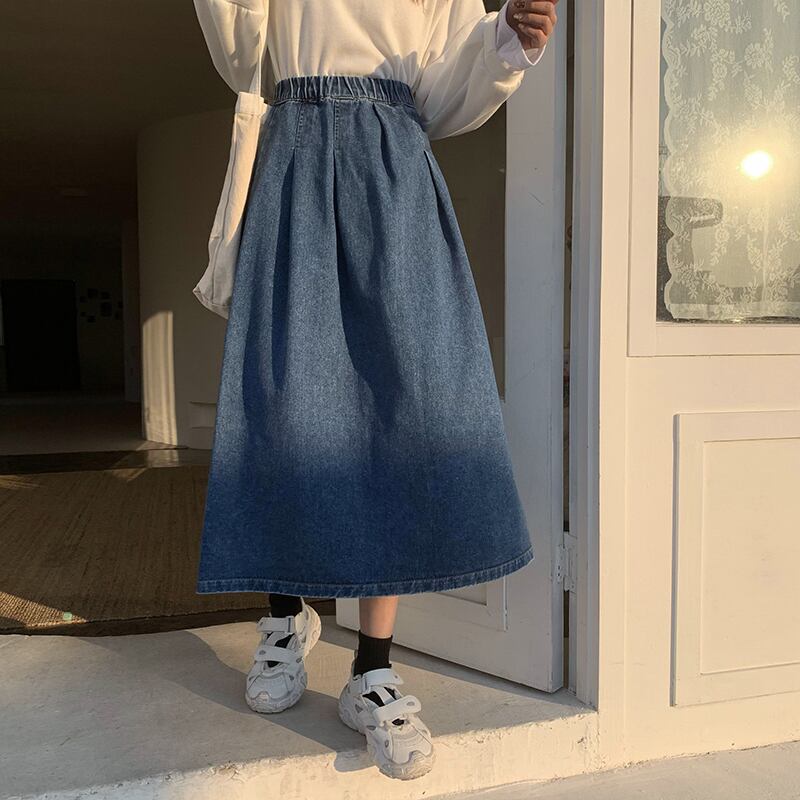 スカート ボトムス 春 夏 秋 冬 きれいめ カジュアル かわいい レディース デニムスカート トラペーズスカート ロング丈 9分丈 アンクル丈 無地 ウエスト ゴム ハイウエスト 青 ブルー かわいい 大人可愛い きれいめ シンプル カジュアル 大人 上品 おしゃれ お洒落 かっこいい レトロ クラシカル エレガント S M L こなれ感 ラフ マニッシュ スポーティー ラブリー キュート ガーリー 個性的 主役級 存在感 レディース 着回し 普段使い 韓国 韓国系 オルチャン 体型カバー 美脚 脚長