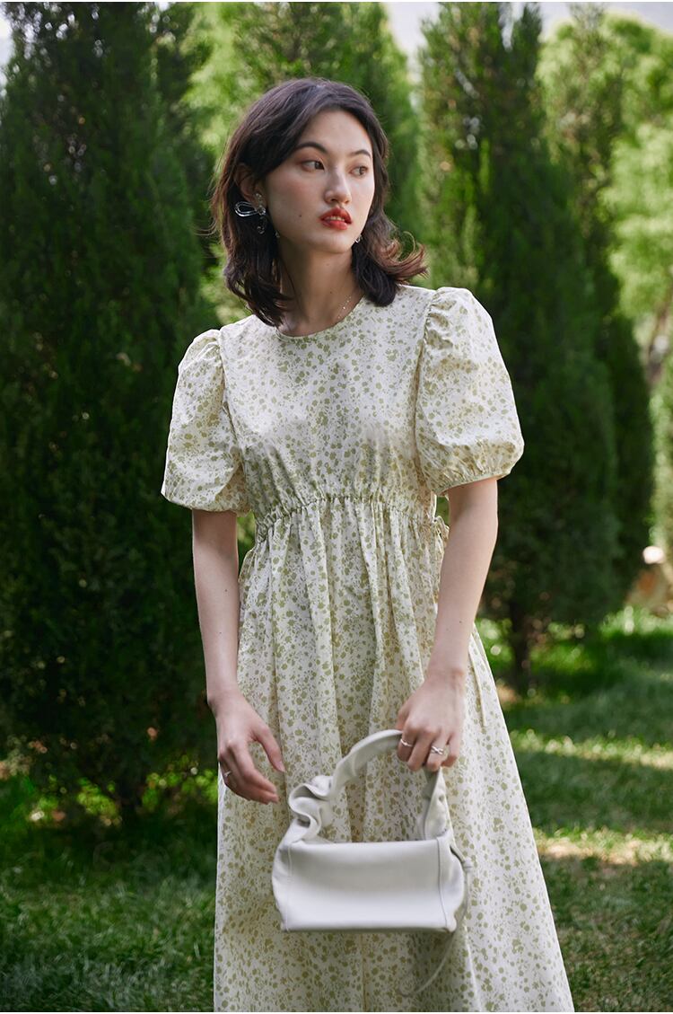 パフスリーブとハイウエストが印象的なガーリーなワンピース。