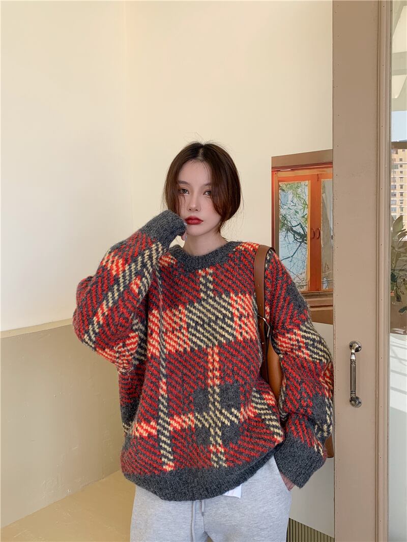 2色 トップス ニット セーター プルオーバー 秋冬 かわいい きれいめ カジュアル ゆったり 長袖 ボリューム袖 萌袖 Uネック ラウンドネック BIGシルエット ケーブルニット 灰色 グレー オレンジ S M L かわいい 大人可愛い きれいめ シンプル カジュアル 大人 上品 おしゃれ ナチュラル かっこいい レトロ チェック柄 韓国 韓国系 オルチャン 韓国ファッション 体型カバー 定番 普段使い インスタ映え こなれ感 ラフ メンズライク マニッシュ ガーリー ルーズ 個性的 クール モード系