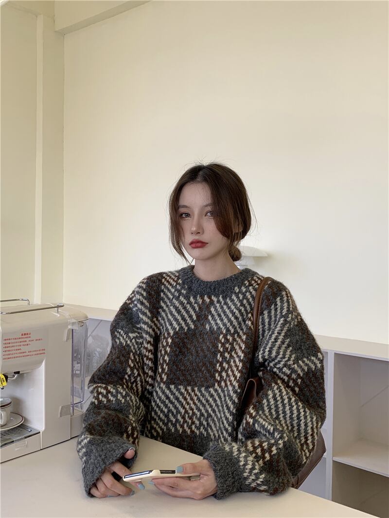 エレガントな印象を与えるチェック柄のレディースセーター。