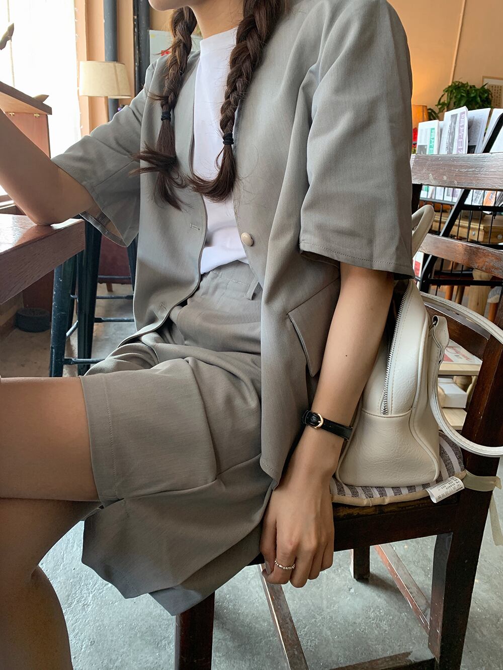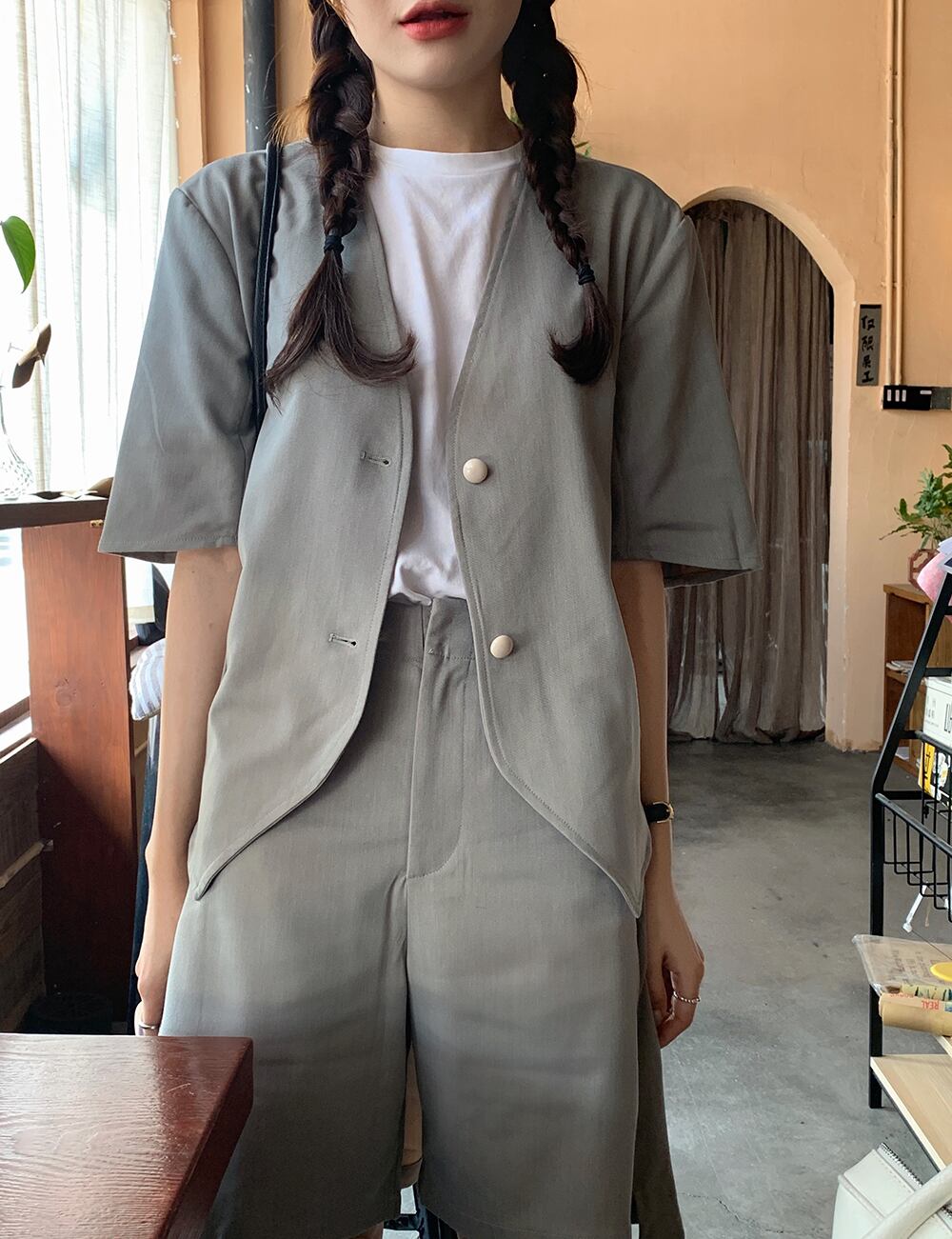 レトロ風 セットアップ 半袖 春 夏 きれいめ カジュアル かわいい フォーマル ジャケット ハーフパンツ ショート ショート丈 膝丈 ひざ丈 五分袖 Vネック 深 Vネック 襟なし 細身 ストレート スマート 裾ワイド ファスナー ポケット ハイウエスト 前開き 灰色 グレー S M かわいい 大人可愛い きれいめ シンプル カジュアル 大人 上品 おしゃれ ナチュラル かっこいい レトロ 無地 韓国 韓国系 オルチャン 韓国ファッション 体型カバー 美脚 脚長 定番 普段使い インスタ映え こなれ感