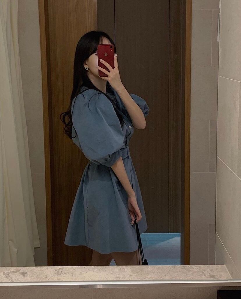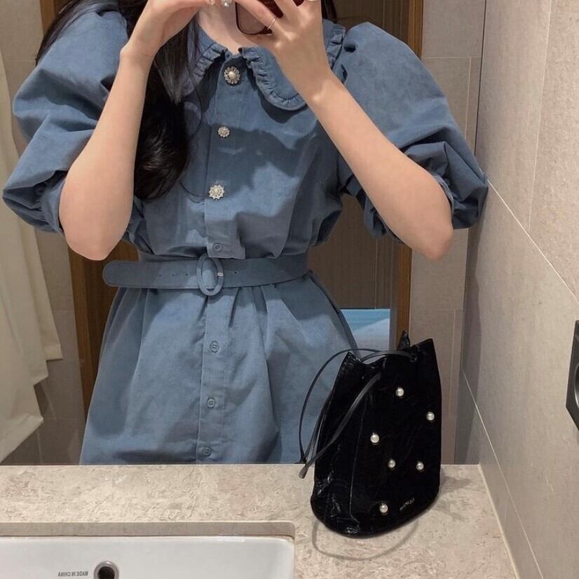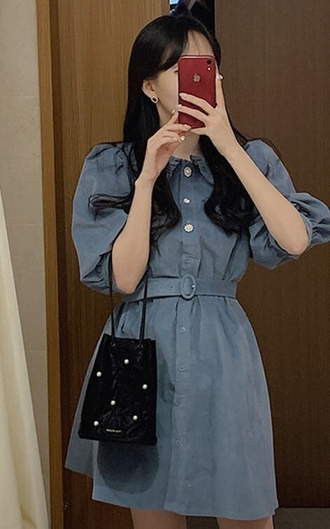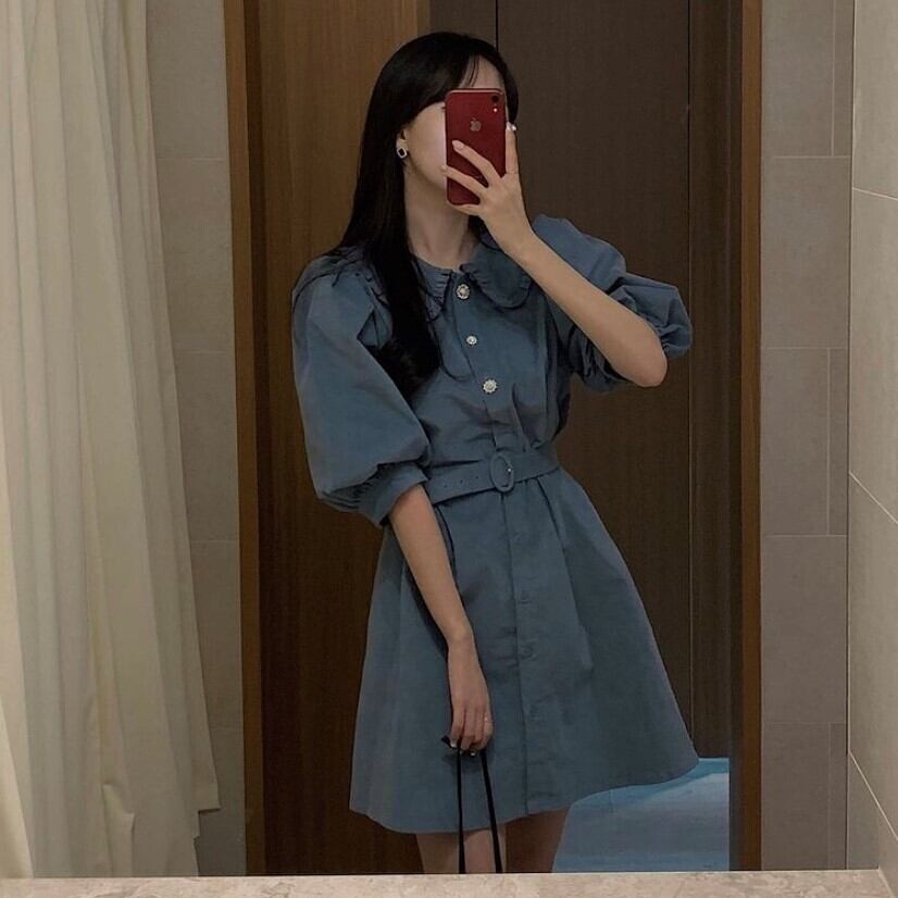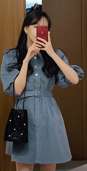 襟付きで大人可愛いワンピース!!ボリュームのあるスリーブが、気になる二の腕を華奢見せ♪ウエストベルトでウエストマークすれば、スタイルアップ効果も抜群!!