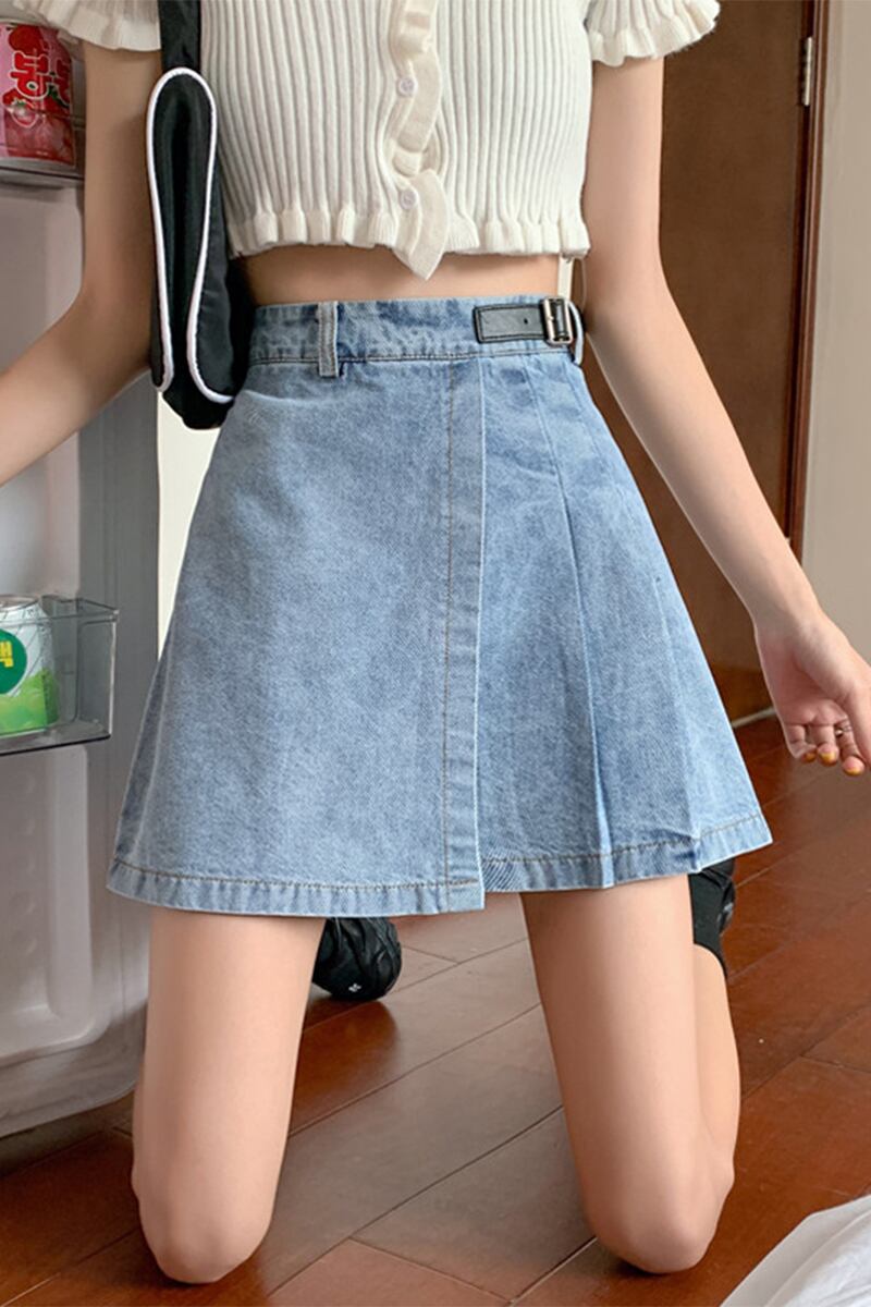 2色 スカート ボトムス 春 夏 秋 冬 きれいめ カジュアル かわいい レディース プリーツスカート デニムスカート トラペーズスカート ミニ丈 ショート丈 膝上 無地 ウエストマーク ハイウエスト プリーツ ベルト アシンメトリー 白 ホワイト 青 ブルー かわいい 大人可愛い きれいめ シンプル カジュアル 大人 上品 おしゃれ お洒落 かっこいい レトロ クラシカル エレガント S M L こなれ感 ラフ マニッシュ ラブリー キュート ガーリー 個性的 主役級 存在感 レディース 着回し