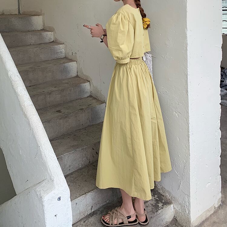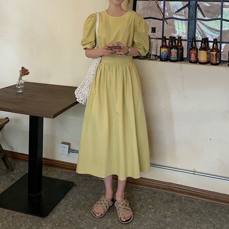 2色 レトロ風 ワンピース 半袖 春夏 カジュアル ロング aライン シャツワンピース aライン Aライン フレア ミモレ ミモレ丈 ロング ロング丈 7分丈 ミディアム丈 ミドル丈 レギュラー丈 五分袖 ぽわん袖 袖コンシャス Uネック ラウンドネック フレア セミフレア バックシャン バックコンシャス ウエストマーク ハイウエスト 黒 ブラック 黄色 イエロー 大人カラー 春カラー 秋カラー ワンサイズ ゆったり ゆる ジャスト かわいい 大人可愛い きれいめ シンプル カジュアル 大人 上品