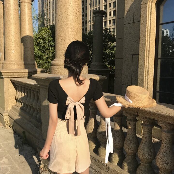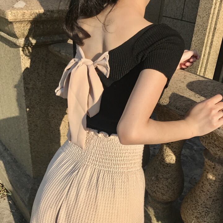 トップス カットソー ニット プルオーバー レディース 春 秋 きれいめ ショート ショート丈 半袖 Uネック ラウンドネック スリム タイト 細身 バックリボン バックシャン バックコンシャス リブニット プルオーバー 黒 ブラック 大人カラー モノトーン S M L ジャスト かわいい 大人可愛い きれいめ シンプル カジュアル 大人 上品 おしゃれ ナチュラル レトロ アジアン リラックス フェミニン 無地 韓国 韓国系 オルチャン 韓国ファッション コーデ スタイル 楽ちん 着回し モテ 美脚