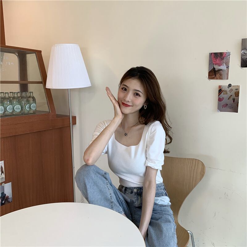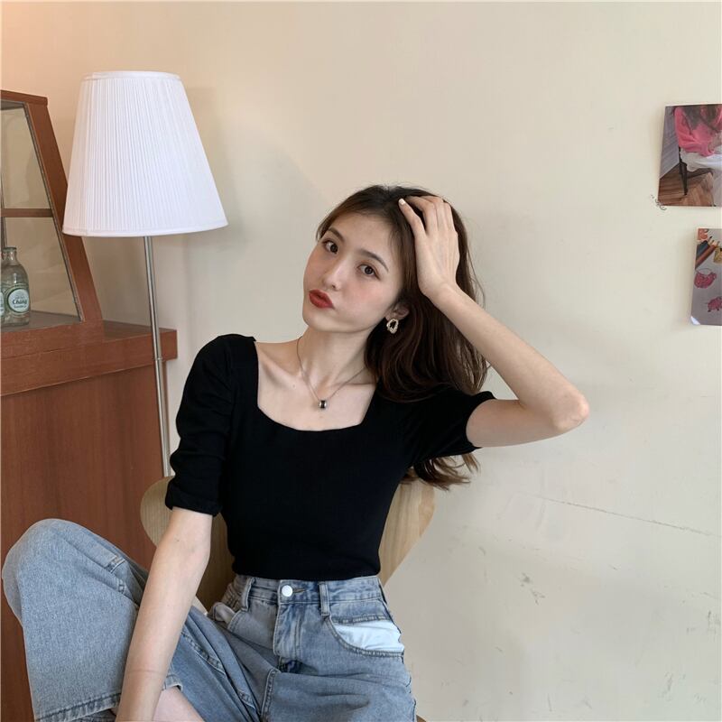 6色 トップス シャツ プルオーバー レディース 春夏 かわいい ショート ショート丈 半袖 ボリューム袖 パフスリーブ スクエアネック スリム タイト プルオーバー 白 ホワイト 黒 ブラック 赤 レッド 緑 グリーン 紫 パープル 黄色 イエロー 大人カラー 春カラー 秋カラー カラバリ ワンサイズ ジャスト かわいい 大人可愛い きれいめ シンプル カジュアル 大人 上品 おしゃれ ナチュラル かっこいい レトロ アジアン リラックス フェミニン 無地 韓国 韓国系 オルチャン 韓国ファッション