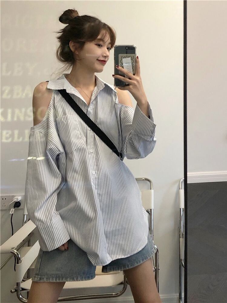 シャツ レディース トップス 長袖 オープンショルダー ストライプ セクシー オフショルダー カジュアルシャツ 日焼け対策 ブラウス 香港スタイル 薄い 薄手 秋 夏 サマー 海 浜辺 リゾート バカンス おしゃれ スタイリッシュ 大人可愛い シック 10代 20代 通勤 ポリエステル ホワイト ブルー 白 青 M L ポロシャツ ストレート ラフ こなれ感 オフィスカジュアル フェミニン 着こなし 大人コーデ 女性らしい きれいめ 柄物 新品 クール かっこいい 優美 優雅 普段使い 大人カジュアル