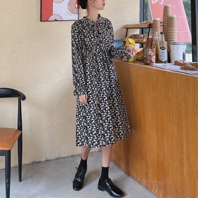 3色 ワンピース 長袖 春 夏 きれいめ カジュアル かわいい フォーマル aライン シャツワンピース Aライン フレア ワンピドレス ミモレ ミモレ丈 ぽわん袖 キャンディスリーブ スタンドカラー ボトルネック ボウタイ フレア セミフレア シフォン リボン ウエストマーク 黒 ブラック 茶色 ブラウン ピンク ワンサイズ かわいい 大人可愛い きれいめ シンプル カジュアル 大人 上品 おしゃれ ナチュラル レトロ 花柄 小花柄 フラワー 韓国 韓国系 オルチャン 韓国ファッション 体型カバー