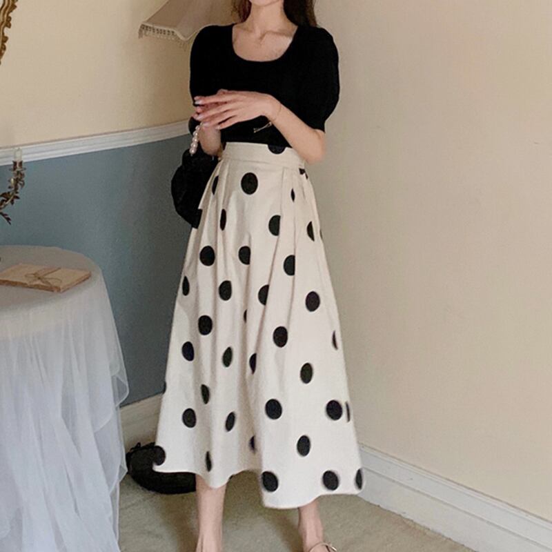 スカート 春夏 きれいめ レディース フレアスカート Aラインスカート ロング丈 ドット柄 ウエスト ゴム ハイウエスト ホワイト かわいい 大人可愛い シンプル カジュアル 大人 上品 おしゃれ レトロ クラシカル S M 美シルエット ラブリー キュート ガーリー ママ 高校生 OL 学生 女の子 10代 20代 30代 40代 参観日 着回し 普段使い ファッション コーデ スタイル 楽ちん モテ 体型カバー 脚長 トレンド インスタ映え オフィス 通勤 通学 デート お出かけ 女子会 お泊まり