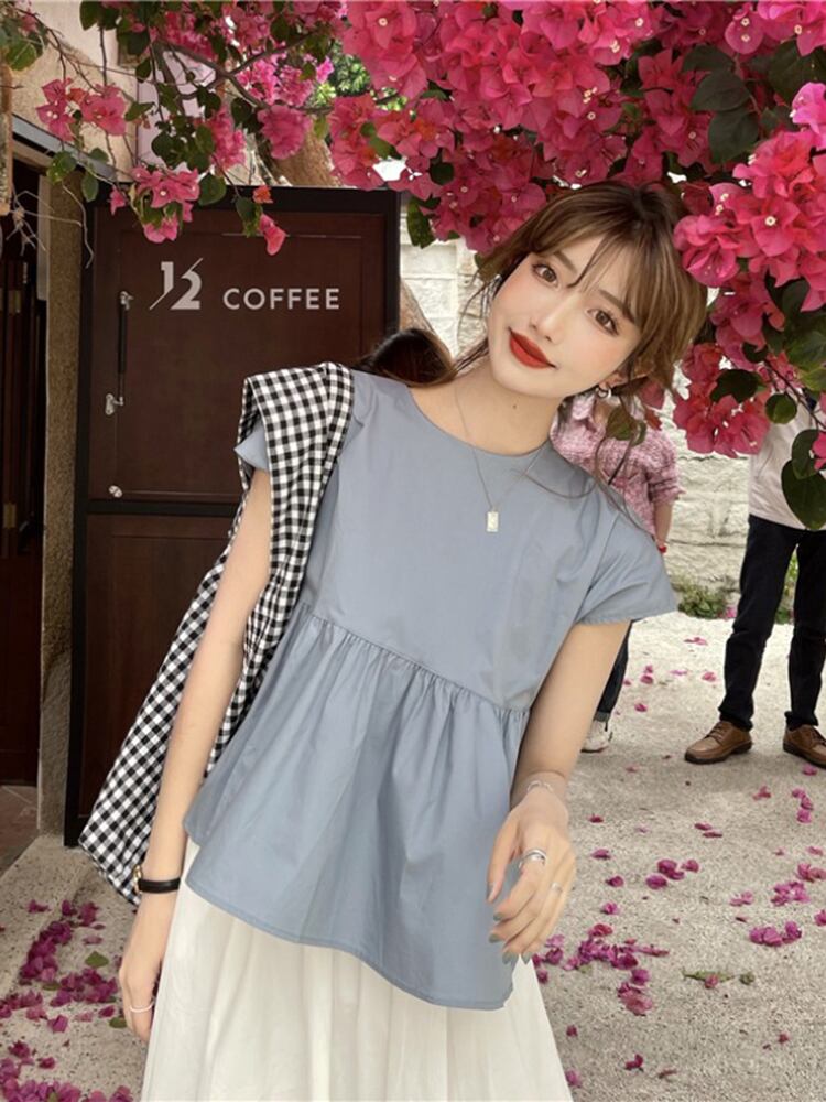 2色 トップス シャツ ブラウス レディース 夏 カジュアル ゆったり 半袖 フレンチスリーブ ラウンドネック ペプラム リボン バックリボン ブルー イエロー ワンサイズ かわいい 大人可愛い きれいめ シンプル 大人 上品 おしゃれ レトロ 女性らしい ふんわり 無地 コーデ スタイル 楽ちん 着回し 体型カバー 普段使い トレンド 10代 20代 30代 40代 50代 こなれ感 キュート オフィス OL 通勤 学生 通学 デート お出かけ 公園デビュー お泊まり イベント 旅行 ショッピング