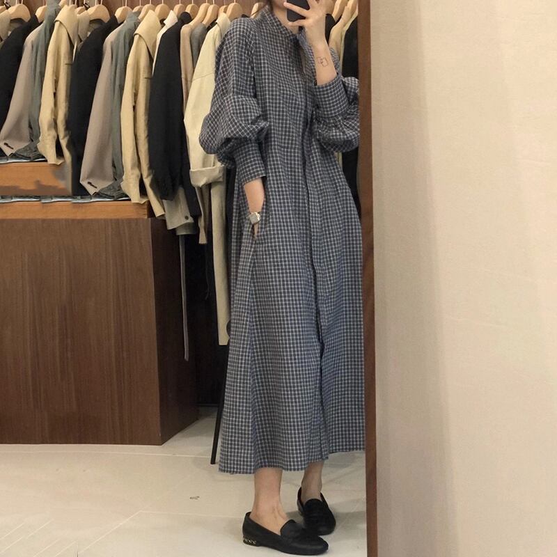 ワンピース 長袖 春 夏 きれいめ カジュアル かわいい フォーマル aライン シャツワンピース マキシ Aライン ワンピドレス ロング ロング丈 9分丈 アンクル丈 七分袖 ぽわん袖 ボリューム袖 袖コンシャス キャンディスリーブ スタンドカラー ボトルネック スリム タイト 細身 ストレート ウエストマーク 前開き 青 ブルー ワンサイズ かわいい 大人可愛い きれいめ シンプル カジュアル 大人 上品 おしゃれ ナチュラル かっこいい レトロ チェック柄 ギンガムチェック 韓国 韓国系 オルチャン