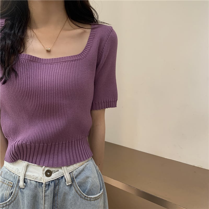 4色 トップス Tシャツ シャツ レディース 春 秋 かわいい ミニ ショート ショート丈 ミニ丈 半袖 スクエアネック 襟なし スリム タイト 細身 リブニット プルオーバー 白 ホワイト 黒 ブラック 紫 パープル オレンジ 大人カラー 春カラー 秋カラー ワンサイズ ジャスト かわいい 大人可愛い きれいめ シンプル カジュアル 大人 上品 おしゃれ ナチュラル かっこいい レトロ リラックス 無地 韓国 韓国系 オルチャン 韓国ファッション コーデ スタイル 楽ちん モテ 定番 普段使い