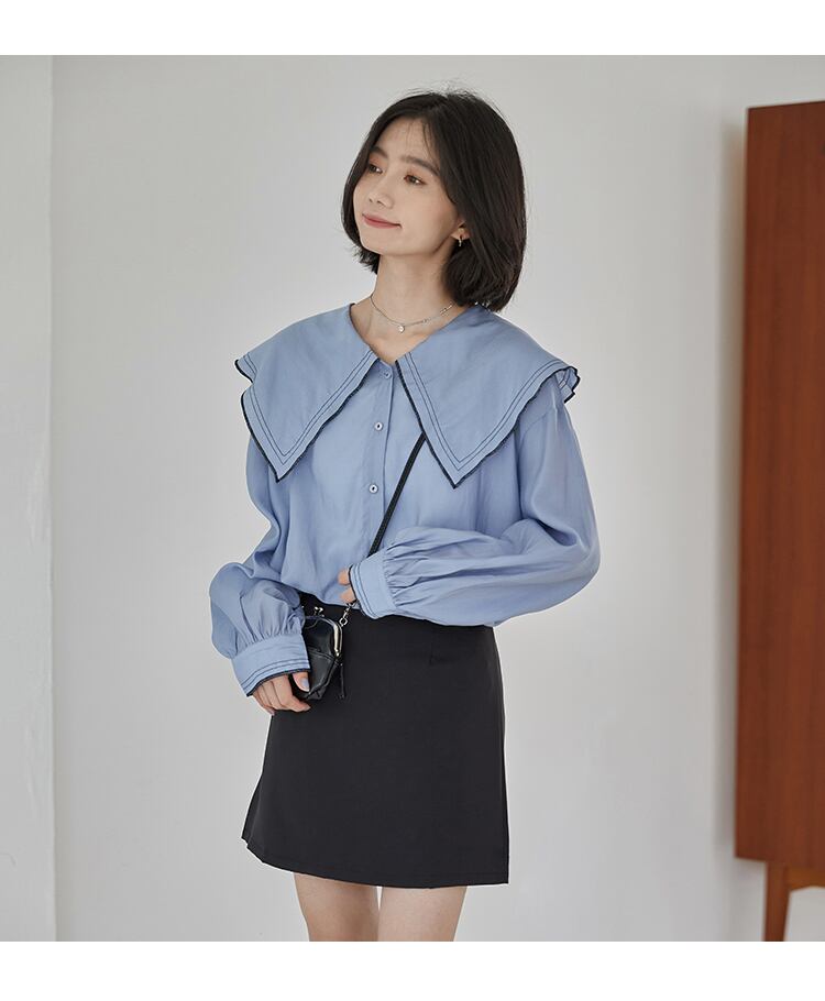 2色 トップス シャツ ブラウス チュニック 夏 春 秋 かわいい カジュアル オーバーサイズ ゆったり 長袖 ボリューム袖 萌袖 カフス ぽわん袖 Vネック ドールカラー ワイドカラー ビッグカラー セーラーカラー フレア セミフレア 裾イン シフォン 前開き シンプル 白 ホワイト 青 ブルー ワンサイズ かわいい 大人可愛い きれいめ シンプル カジュアル 大人 上品 おしゃれ ナチュラル かっこいい レトロ リラックス 無地 韓国 韓国系 オルチャン 韓国ファッション 体型カバー 定番 ガーリー
