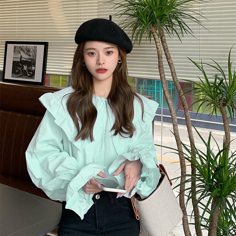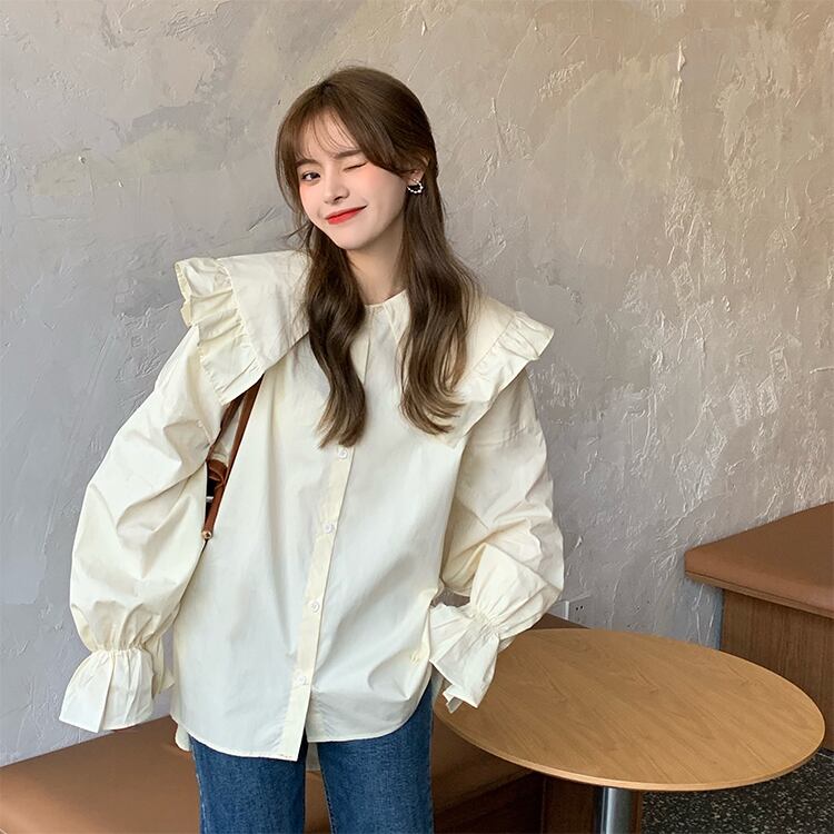 2色 トップス ブラウス カットソー レディース 春 秋 かわいい ゆったり オーバーサイズ ゆったり 大きめ ミモレ丈 長袖 ボリューム袖 フレアスリーブ 萌袖 フリル袖 襟付き 大きな襟 でか襟 ビッグカラー フリルカラー BIGシルエット フレア セミフレア フリル 前開き ボタン 白 ホワイト 青 ブルー 春カラー ワンサイズ 大きめ ゆったり かわいい きれいめ シンプル カジュアル 上品 おしゃれ ナチュラル かっこいい レトロ リラックス フェミニン 無地 コーデ スタイル 楽ちん 着回し