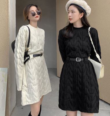 2色 ワンピース 長袖 秋冬 かわいい aライン aライン Aライン フレア ニット ワンピ ミニ ミニ丈 ショート ショート丈 膝丈 ひざ丈 膝上 ボリューム袖 袖コンシャス Uネック ラウンドネック 襟なし フレア セミフレア Aライン ウエストリボン もこもこ モコモコ ふわふわ 編み込み 黒 ブラック くすみカラー 大人カラー アプリコット S M L XL 小さいサイズ 大きいサイズ ゆったり ゆる かわいい 大人可愛い きれいめ シンプル カジュアル 大人 上品 おしゃれ ナチュラル