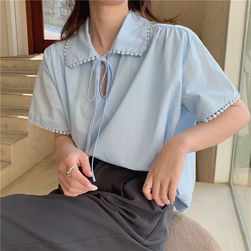 2色 カラバリ カラーバリエーション トップス ブラウス レディース 春夏 かわいい きれいめ カジュアル 半袖 五分袖 ドロップショルダー Vネック 襟付き ストレート Iライン リボン 透け感 シンプル 色展開 白 ホワイト 青 ブルー カラバリ S M L ゆったり かわいい 大人可愛い きれいめ シンプル カジュアル 大人 上品 おしゃれ ナチュラル 無地 コーデ スタイル 楽ちん 着回し モテ 体型カバー 10代 20代 30代 こなれ感 ラフ ラブリー キュート ガーリー 個性的 クール