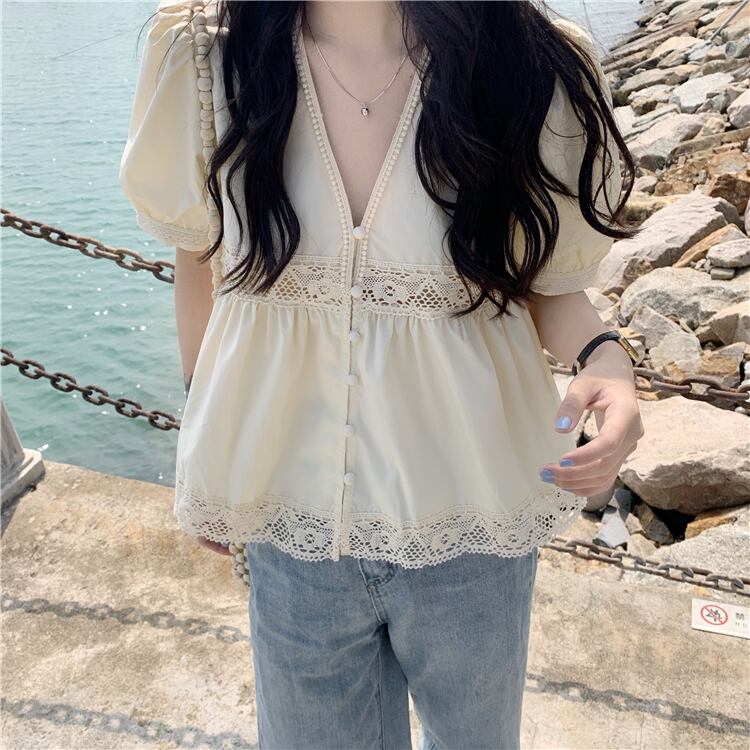 ワンカラー トップス ブラウス レディース 春夏 かわいい きれいめ カジュアル 半袖 五分袖 パフスリーブ Vネック 襟なし ペプラム 切り替えデザイン レース ウエストマーク 透け感 シンプル ベージュ ワンサイズ かわいい 大人可愛い きれいめ シンプル カジュアル 大人 上品 おしゃれ ナチュラル 無地 スタイル 楽ちん 着回し モテ 体型カバー 普段使い 10代 20代 こなれ感 ラブリー キュート ガーリー 個性的 クール モード系 エレガント モダン 存在感 カジュアル OL 通勤 学生
