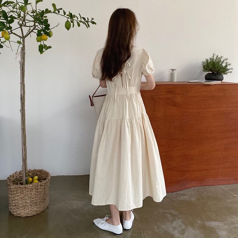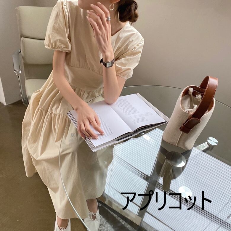 3色 ワンピース 半袖 春夏 きれいめ かわいい ロング aライン Aライン フレア ワンピドレス フレアスカート ロング ロング丈 五分袖 ボリューム袖 ボリュームスリーブ パフスリーブ ラウンドネック 襟なし フレア セミフレア 切り替えデザイン バックコンシャス 背中魅せ シフォン リボン ウエストマーク バックリボン ハイウエスト 透け感 色展開 白 ホワイト 黒 ブラック カラバリ アプリコット ワンサイズ かわいい 大人可愛い きれいめ シンプル カジュアル 大人 上品 おしゃれ ナチュラル