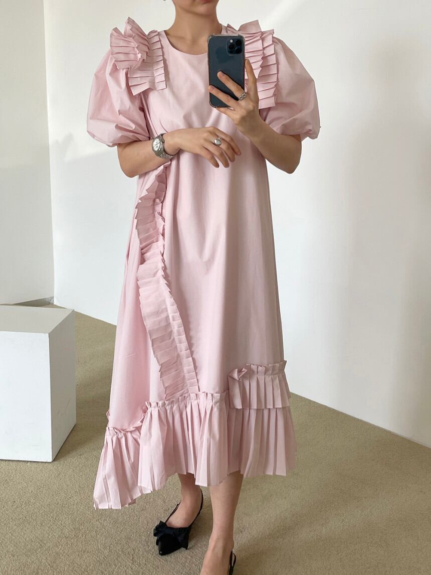 3色 ワンピース 半袖 春夏 きれいめ かわいい ロング aライン Aライン ワンピドレス ロング ロング丈 五分袖 ボリューム袖 ボリュームスリーブ 袖コンシャス パフスリーブ 萌袖 ラウンドネック 襟なし 切り替えデザイン プリーツ フリル ウエストマーク 色展開 白 ホワイト ピンク カラバリ アプリコット ワンサイズ ゆったり ゆる かわいい 大人可愛い きれいめ シンプル 大人 上品 おしゃれ 無地 スタイル モテ 体型カバー インスタ映え ラブリー キュート ガーリー 個性的 クール