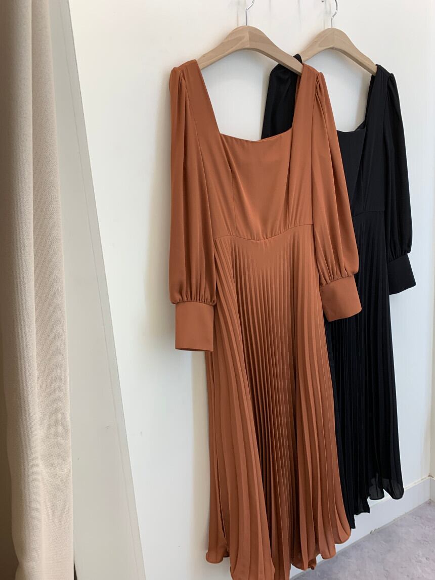 2色 ワンピース 長袖 春 秋 冬 きれいめ カジュアル かわいい ロング フォーマル aライン Aライン フレア ワンピドレス プリーツスカート ロング ロング丈 マキシ マキシ丈 9分丈 アンクル丈 7分丈 ミディアム丈 ミドル丈 レギュラー丈 七分袖 ぽわん袖 ボリューム袖 ボリュームスリーブ キャンディスリーブ パフスリーブ スクエアネック フレア セミフレア スリム タイト 細身 ストレート プリーツ ウエストマーク 黒 ブラック オレンジ S M L かわいい 大人可愛い きれいめ シンプル