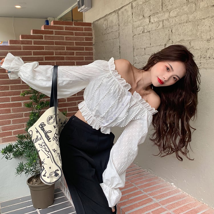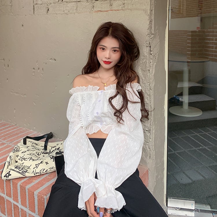 ブラウス カットソー 春夏 かわいい きれいめ カジュアル ショート ショート丈 長袖 ボリューム袖 フレアスリーブ キャンディスリーブ ぽわん袖 オフショルダー オフショル フレア セミフレア シフォン フリル 透け感 白 ホワイト ワンサイズ かわいい 大人可愛い きれいめ シンプル カジュアル 大人 上品 おしゃれ ナチュラル 無地 韓国 韓国系 オルチャン 韓国ファッション 体型カバー 定番 普段使い インスタ映え こなれ感 ラフ ラブリー キュート ガーリー 個性的 セクシー 主役級 存在感