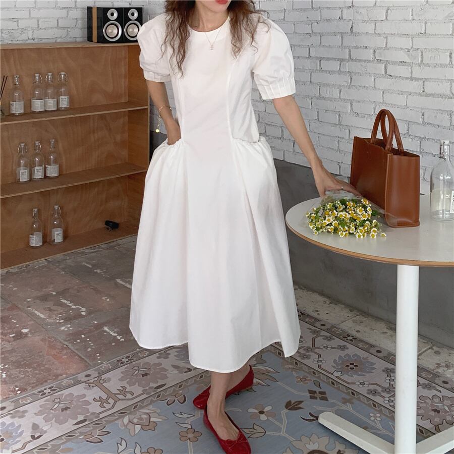 ワンピース 半袖 春 夏 きれいめ カジュアル かわいい ロング aライン Aライン フレア ワンピドレス フレアスカート ロング ロング丈 アンクル丈 7分丈 ミディアム丈 ミドル丈 レギュラー丈 五分袖 ボリューム袖 ボリュームスリーブ 袖コンシャス パフスリーブ Uネック ラウンドネック フレア セミフレア ポケット 白 ホワイト ワンサイズ フリーサイズ かわいい 大人可愛い きれいめ シンプル カジュアル 大人 上品 おしゃれ ナチュラル レトロ 無地 韓国 韓国系 オルチャン