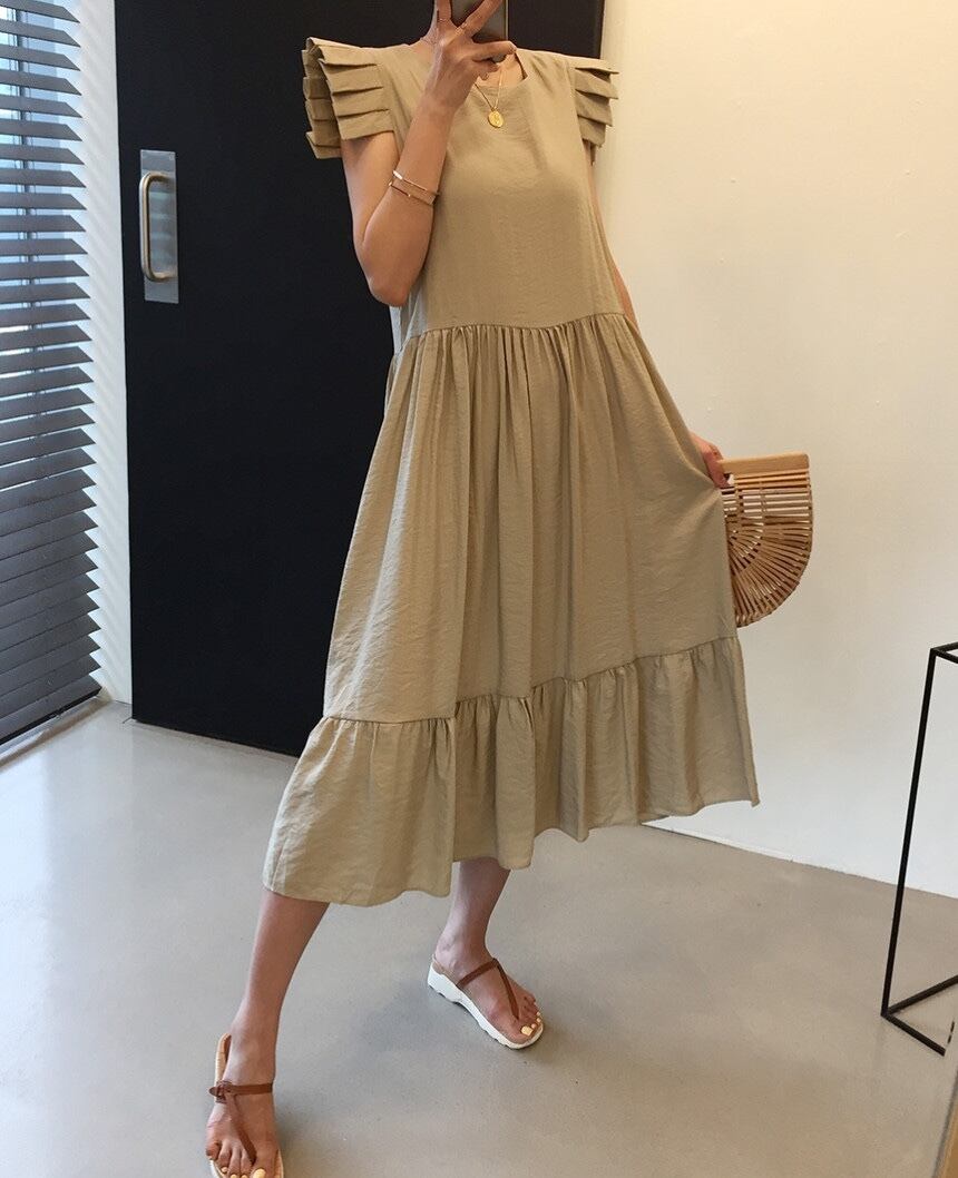 2色 ワンピース ノースリーブ 夏 きれいめ カジュアル かわいい ロング aライン Aライン フレア ティアード ロング ロング丈 アンクル丈 7分丈 ミディアム丈 ミドル丈 レギュラー丈 フリル袖 Uネック ラウンドネック フレア セミフレア 切り替えデザイン プリーツ フリル 緑 グリーン カーキ フリーサイズ かわいい 大人可愛い きれいめ シンプル カジュアル 大人 上品 おしゃれ ナチュラル かっこいい レトロ 無地 韓国 韓国系 オルチャン 韓国ファッション 体型カバー 定番 普段使い