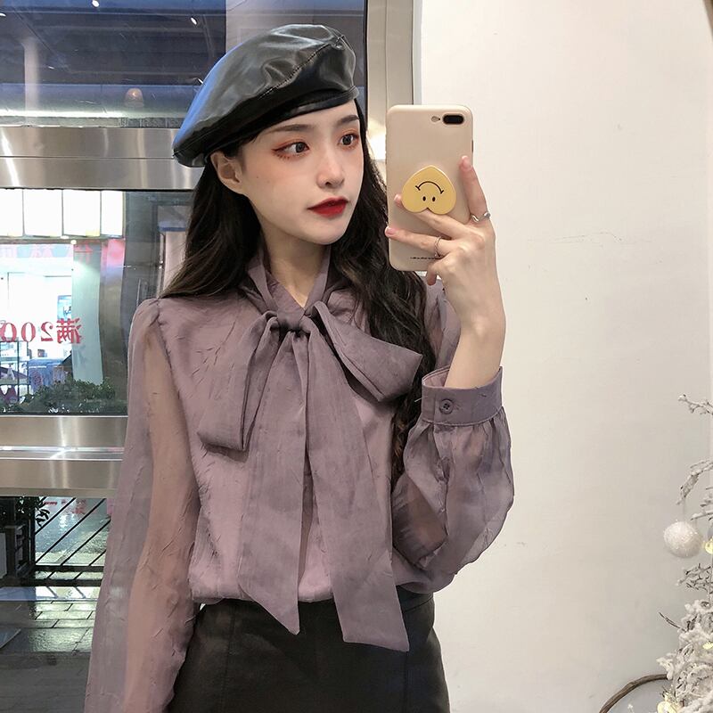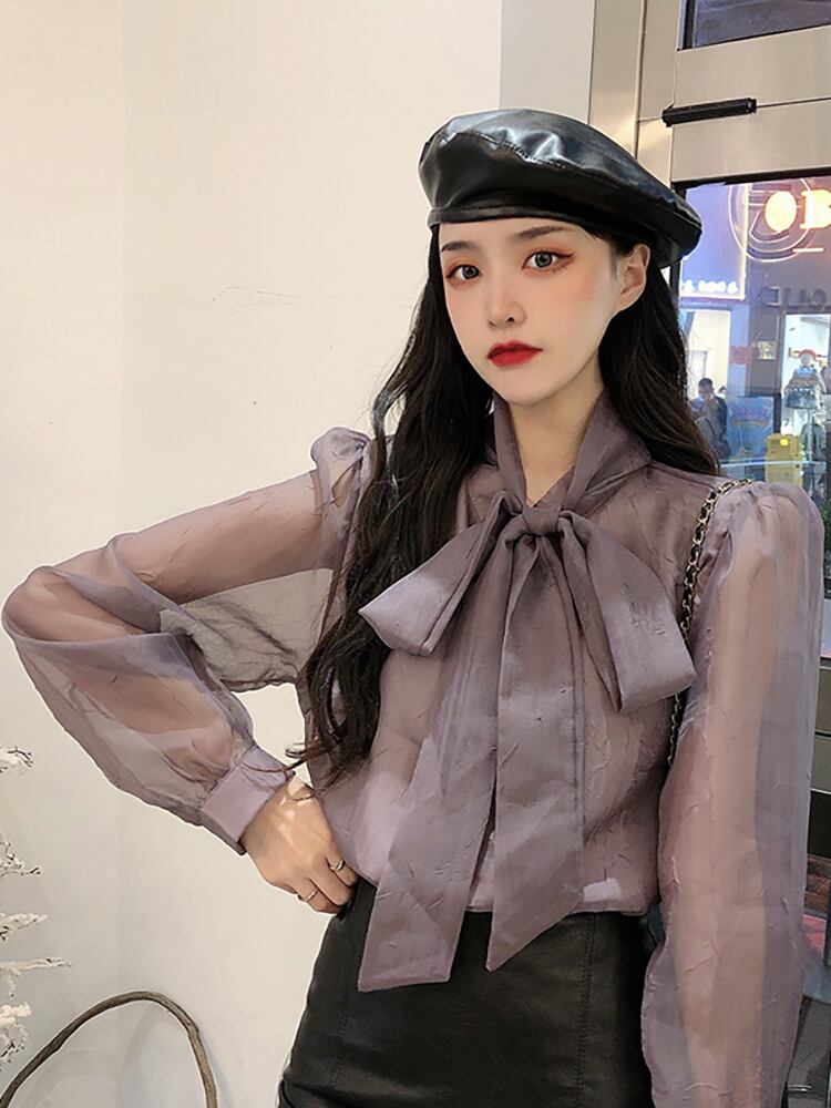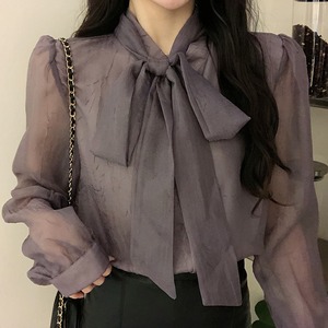 2色 シャツ ブラウス カットソー 春 秋 かわいい きれいめ カジュアル ゆったり 長袖 ボリューム袖 パフスリーブ カシュクール ボウタイ フレア セミフレア 裾イン シフォン リボン 透け感 シースルー 白 ホワイト 紫 パープル くすみカラー ワンサイズ フリーサイズ かわいい 大人可愛い きれいめ シンプル カジュアル 大人 上品 おしゃれ ナチュラル レトロ 無地 韓国 韓国系 オルチャン 韓国ファッション 体型カバー 定番 普段使い インスタ映え こなれ感 ラブリー キュート ガーリー