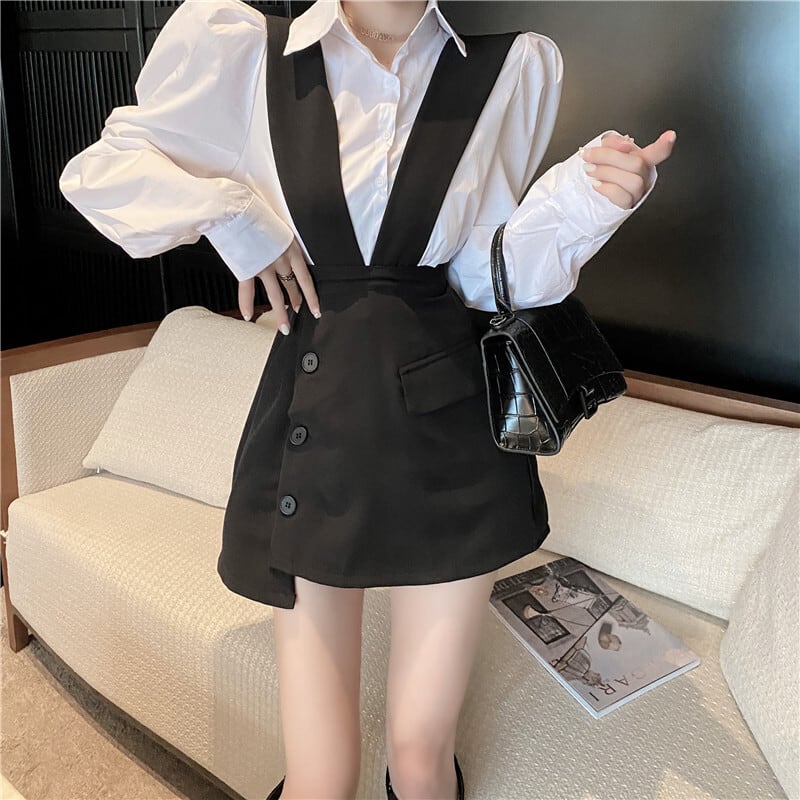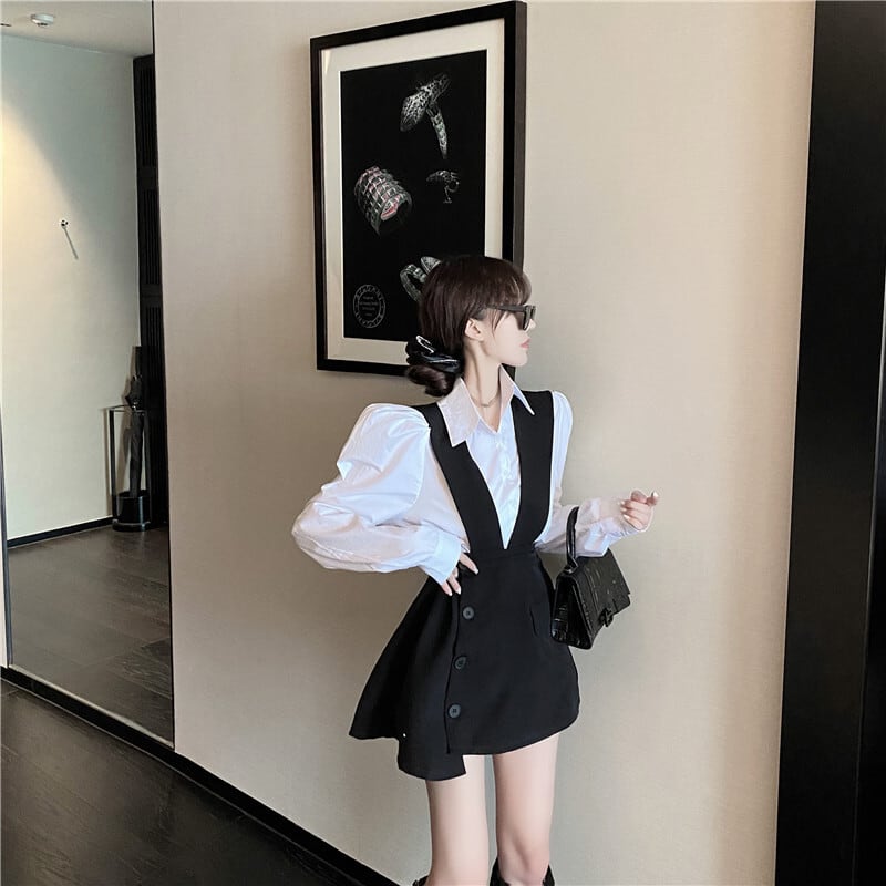 ブラウス&ストラップスカート 2色 レトロ風 セットアップ 長袖 春 夏 秋 きれいめ カジュアル かわいい aライン Aライン ジャンパースカート サロペット ミニ ミニ丈 ショート ショート丈 膝上 ぽわん袖 ボリューム袖 ボリュームスリーブ 袖コンシャス パフスリーブ ドルマンスリーブ Vネック レギュラーカラー フレア セミフレア ウエストマーク ポケット 前開き ボタン 白 ホワイト 黒 ブラック ベージュ S M L かわいい 大人可愛い きれいめ シンプル カジュアル おしゃれ
