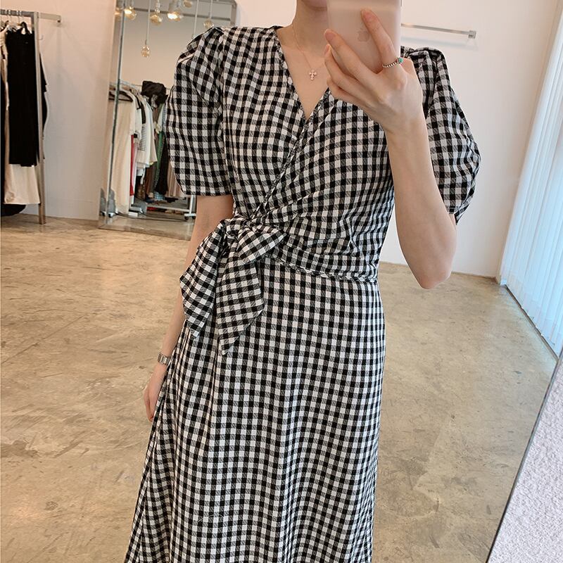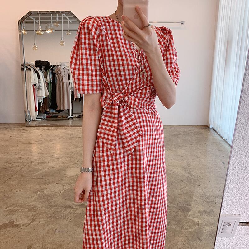 2色 レトロ風 リボン ワンピース 半袖 春 夏 きれいめ カジュアル かわいい aライン Aライン フレア ワンピドレス ロング ロング丈 9分丈 アンクル丈 ボリューム袖 ボリュームスリーブ 袖コンシャス パフスリーブ カシュクール フレア セミフレア リボン ウエストマーク ウエストリボン 黒 ブラック 赤 レッド ワンサイズ かわいい 大人可愛い きれいめ シンプル カジュアル 大人 上品 おしゃれ ナチュラル レトロ 柄 チェック柄 ギンガムチェック 韓国 韓国系 オルチャン 韓国ファッション