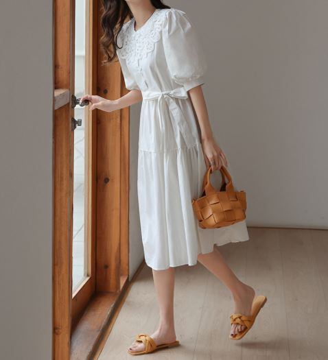 2色 レトロ風 ワンピース 半袖 春夏 きれいめ カジュアル かわいい aライン Aライン フレア ティアード ワンピドレス 膝丈 ひざ丈 膝下 ミモレ ミモレ丈 五分袖 ぽわん袖 パフスリーブ ドールカラー ワイドカラー フリルカラー フレア セミフレア 切り替えデザイン リボン ベルト ウエストマーク ウエストリボン 白 ホワイト 青 ブルー S M L XL 2XL かわいい 大人可愛い きれいめ シンプル カジュアル 大人 上品 おしゃれ ナチュラル レトロ 無地 韓国 韓国系 オルチャン