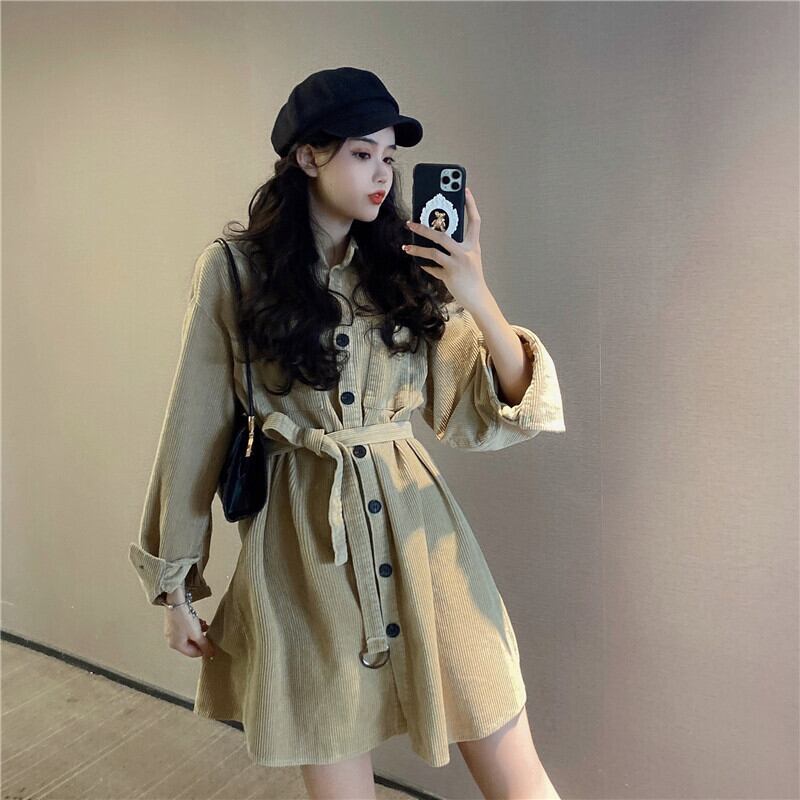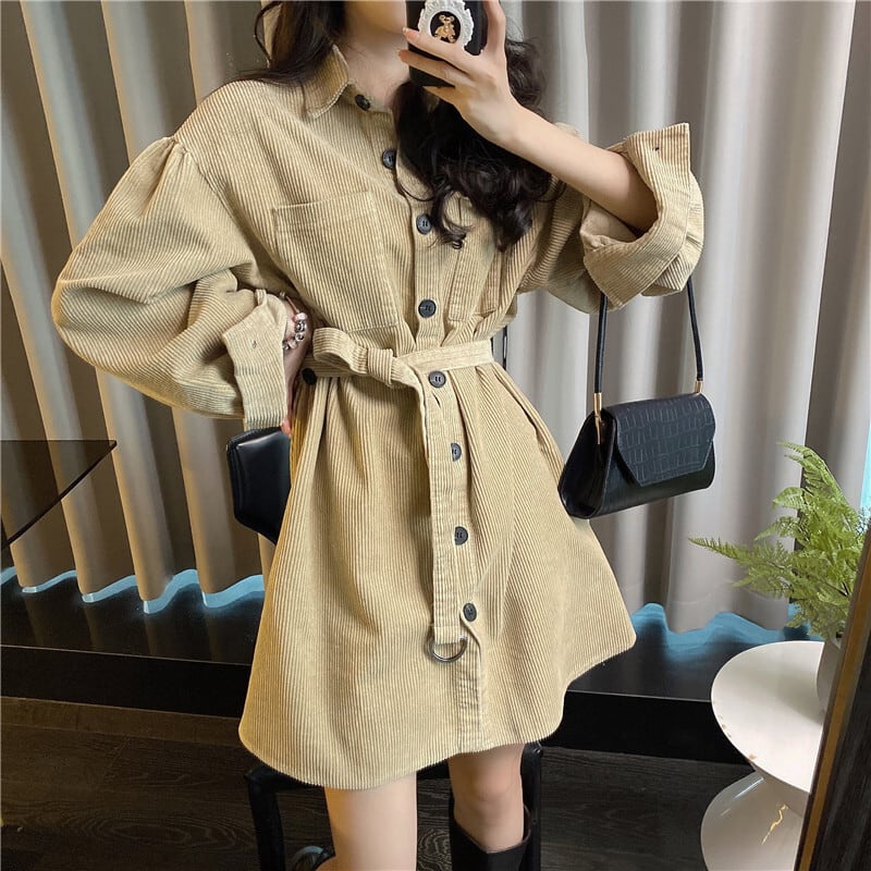 2色 ワンピース 長袖 春 夏 秋 きれいめ カジュアル かわいい aライン シャツワンピース Aライン ショート ショート丈 膝上 ボリューム袖 ボリュームスリーブ パフスリーブ ドロップショルダー レギュラーカラー BIGシルエット ベルト ウエストマーク ポケット 前開き ボタン 緑 グリーン アプリコット S M L XL かわいい 大人可愛い きれいめ シンプル カジュアル 大人 上品 おしゃれ ナチュラル かっこいい レトロ 無地 韓国 韓国系 オルチャン 韓国ファッション 体型カバー 定番
